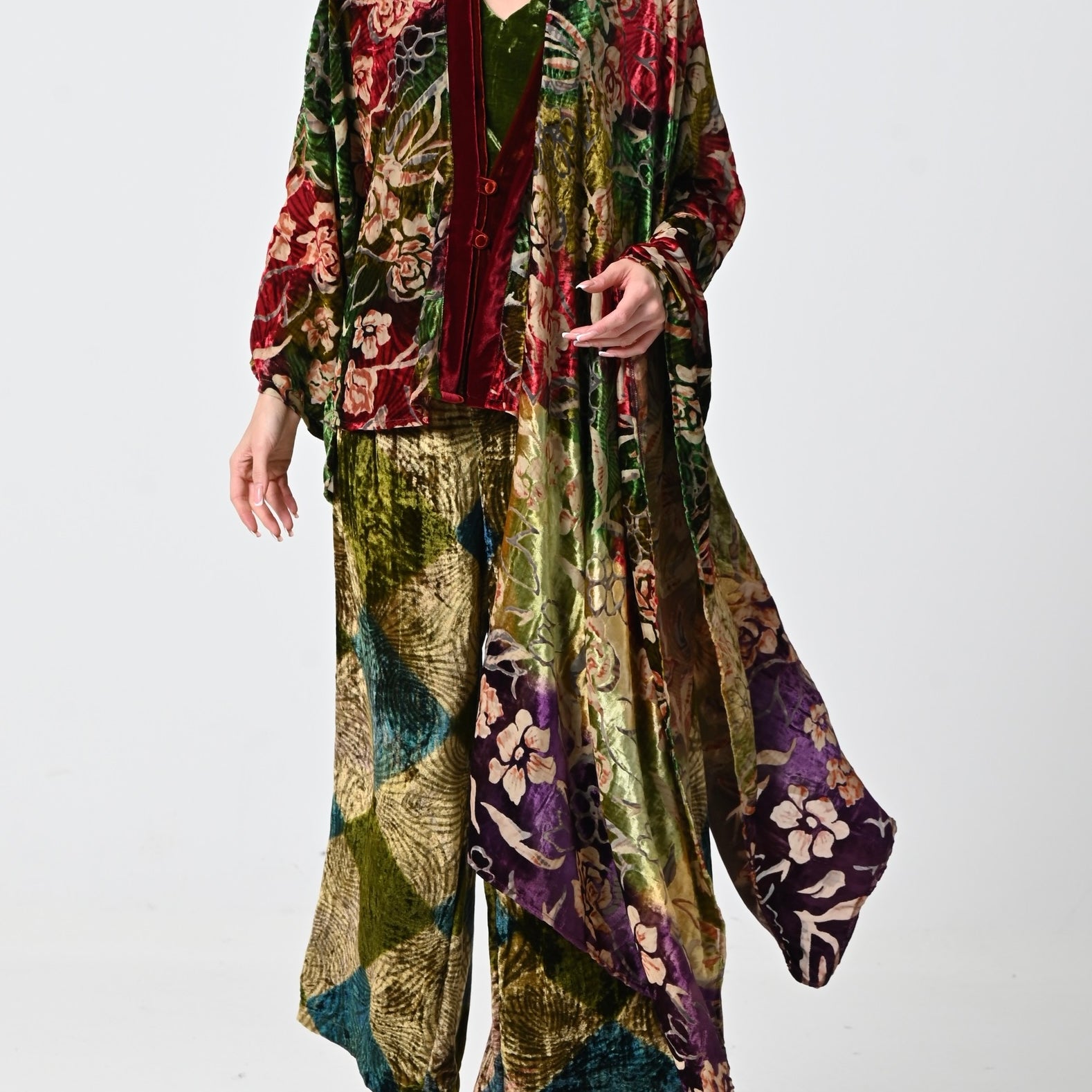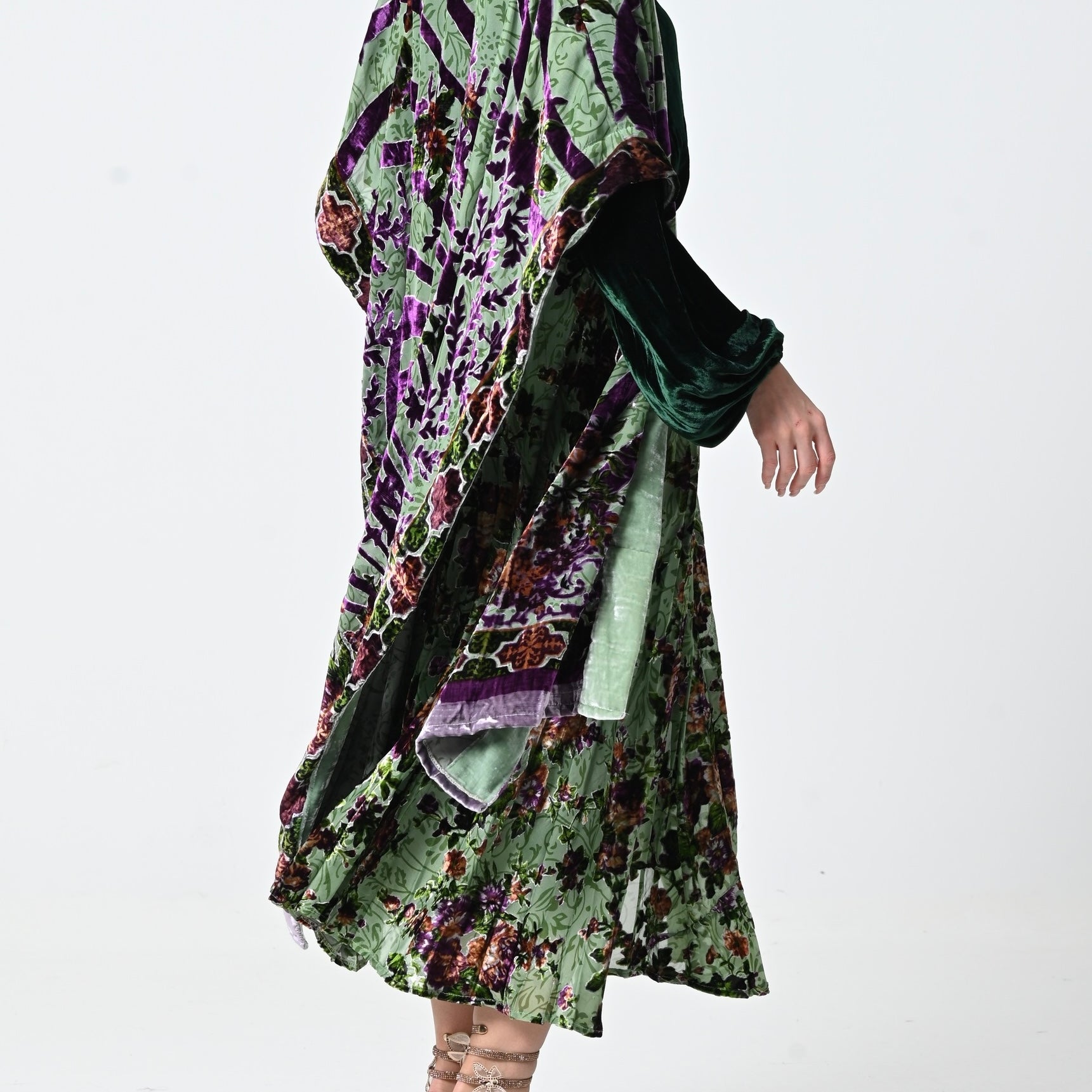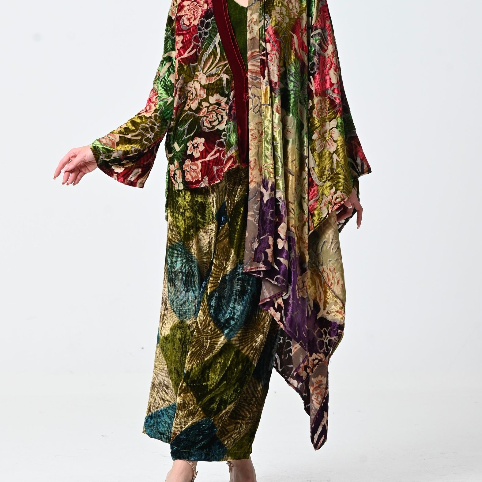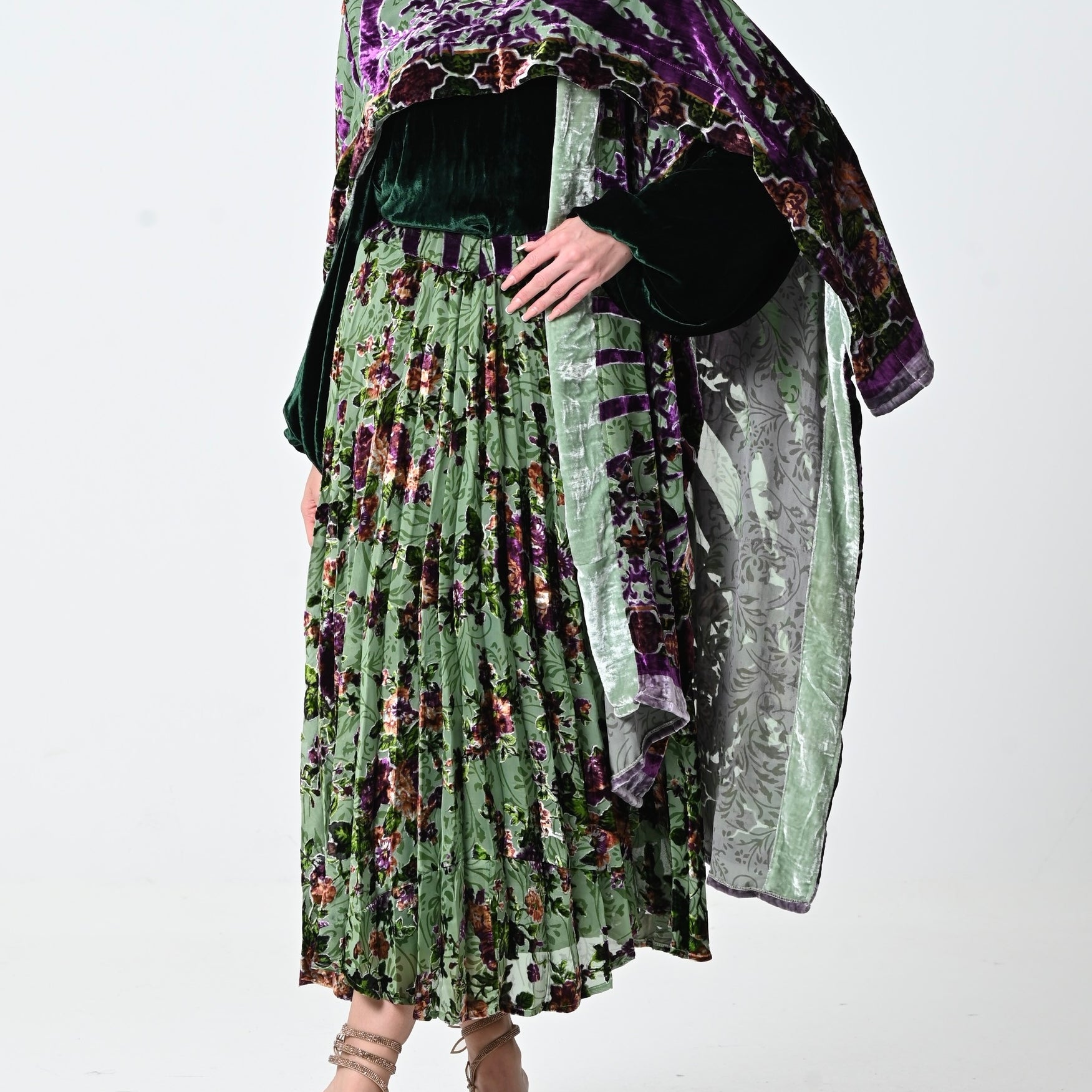 Green Floral Velvet Chiffon Shawl Set