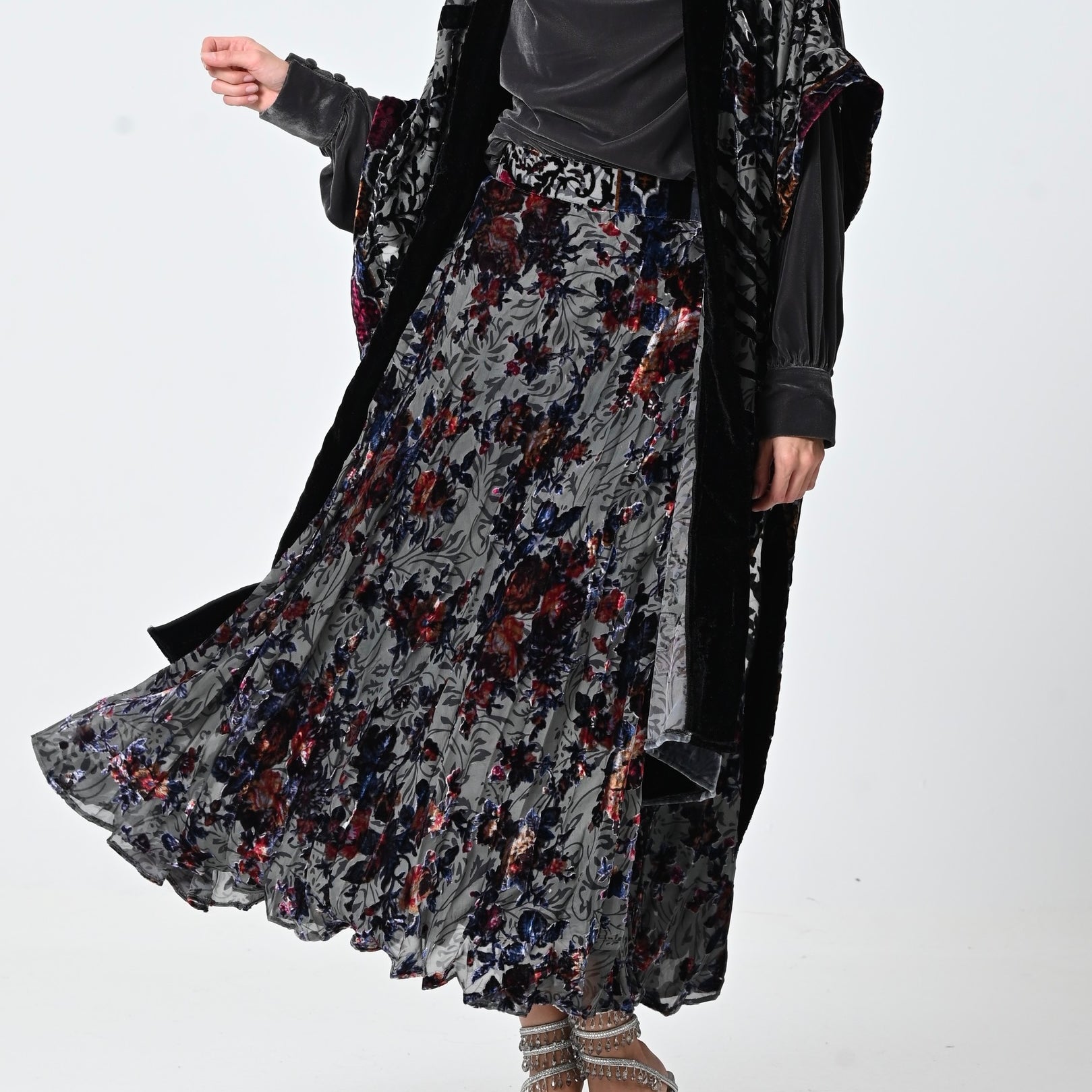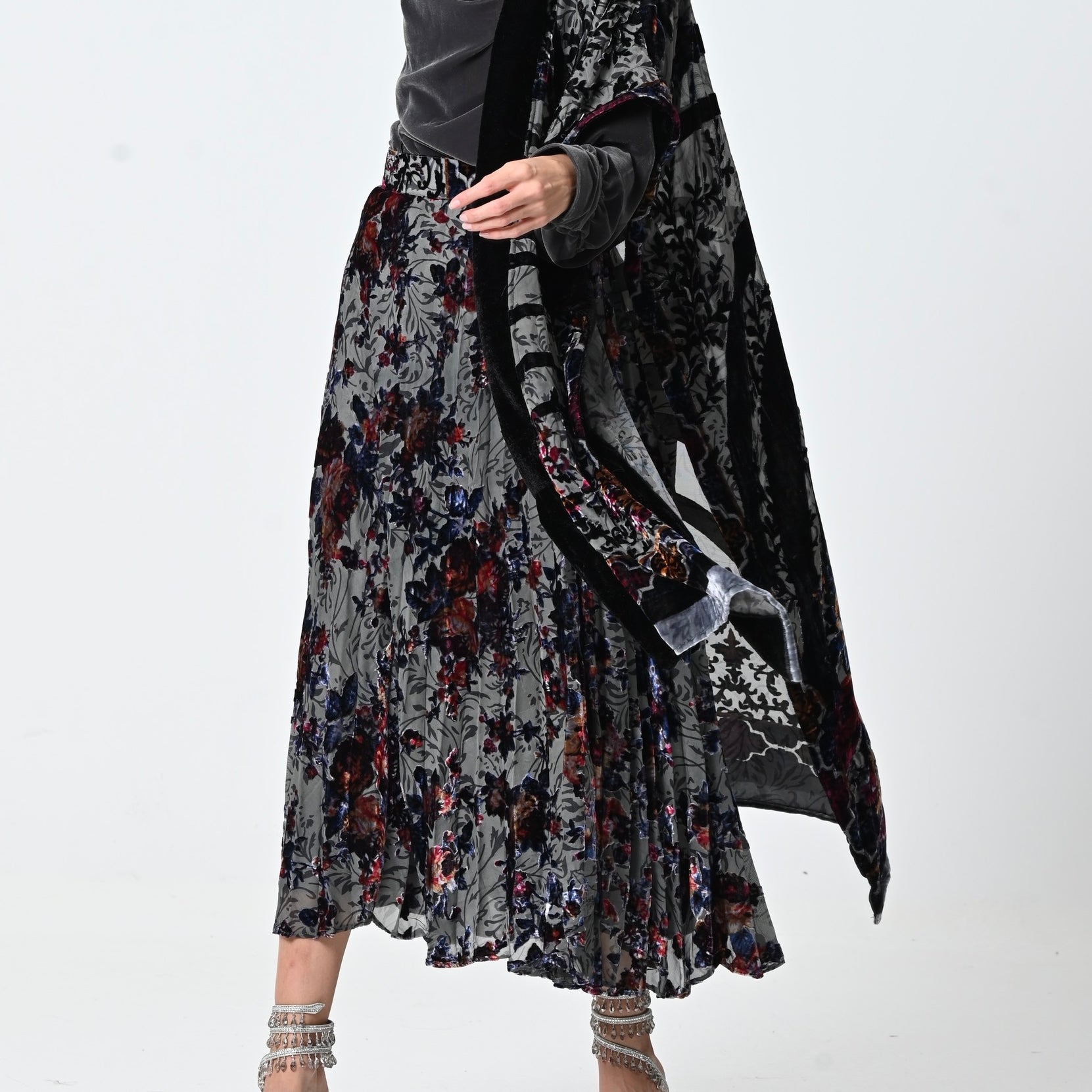 Grey Floral Velvet Chiffon Shawl Set