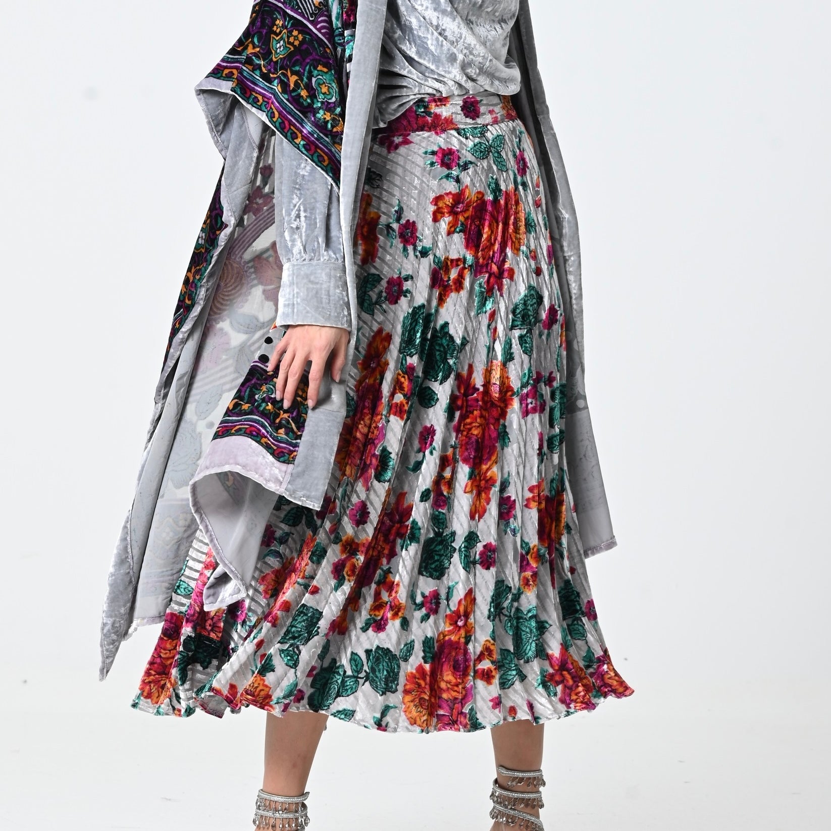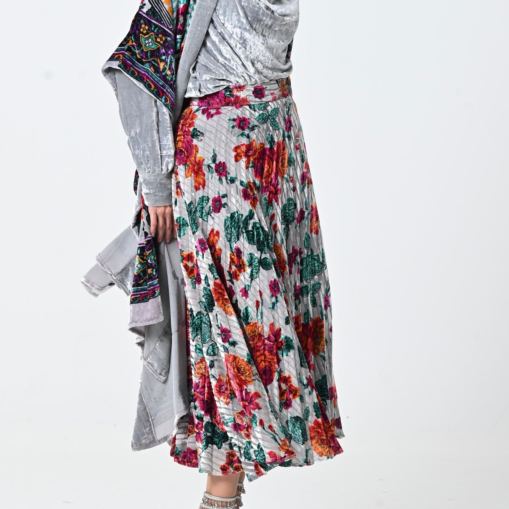 Grey colorful Velvet Shawl Set