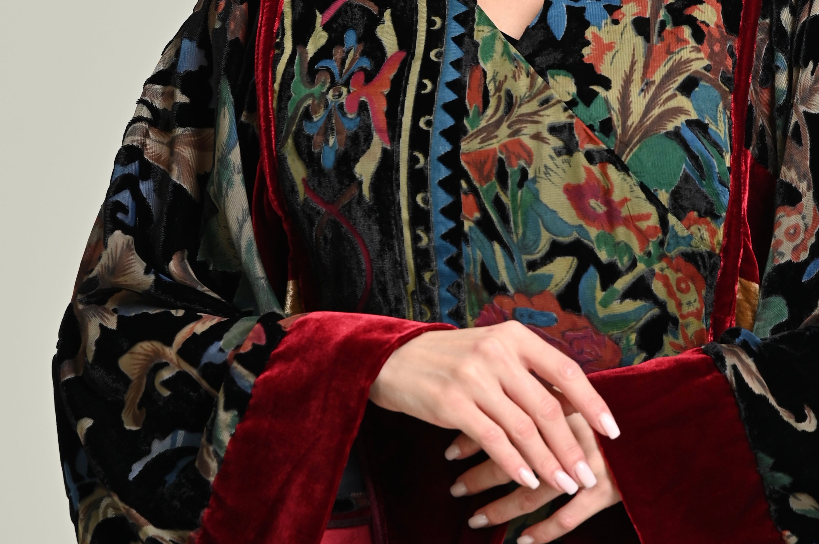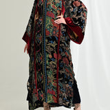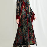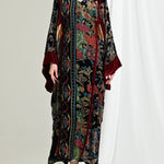 - A kaftan crafted from printed silk velvet with a distinctive pattern.