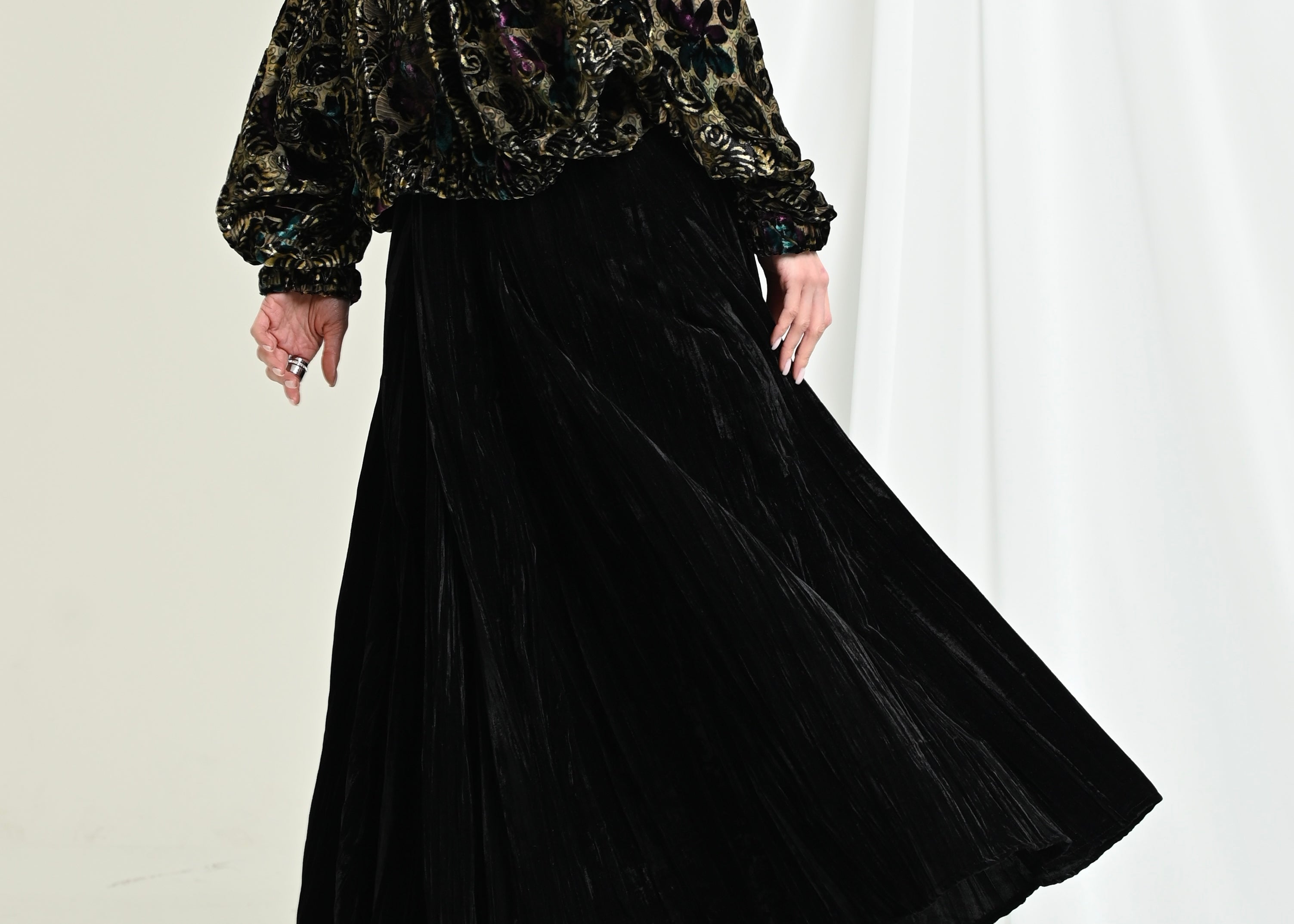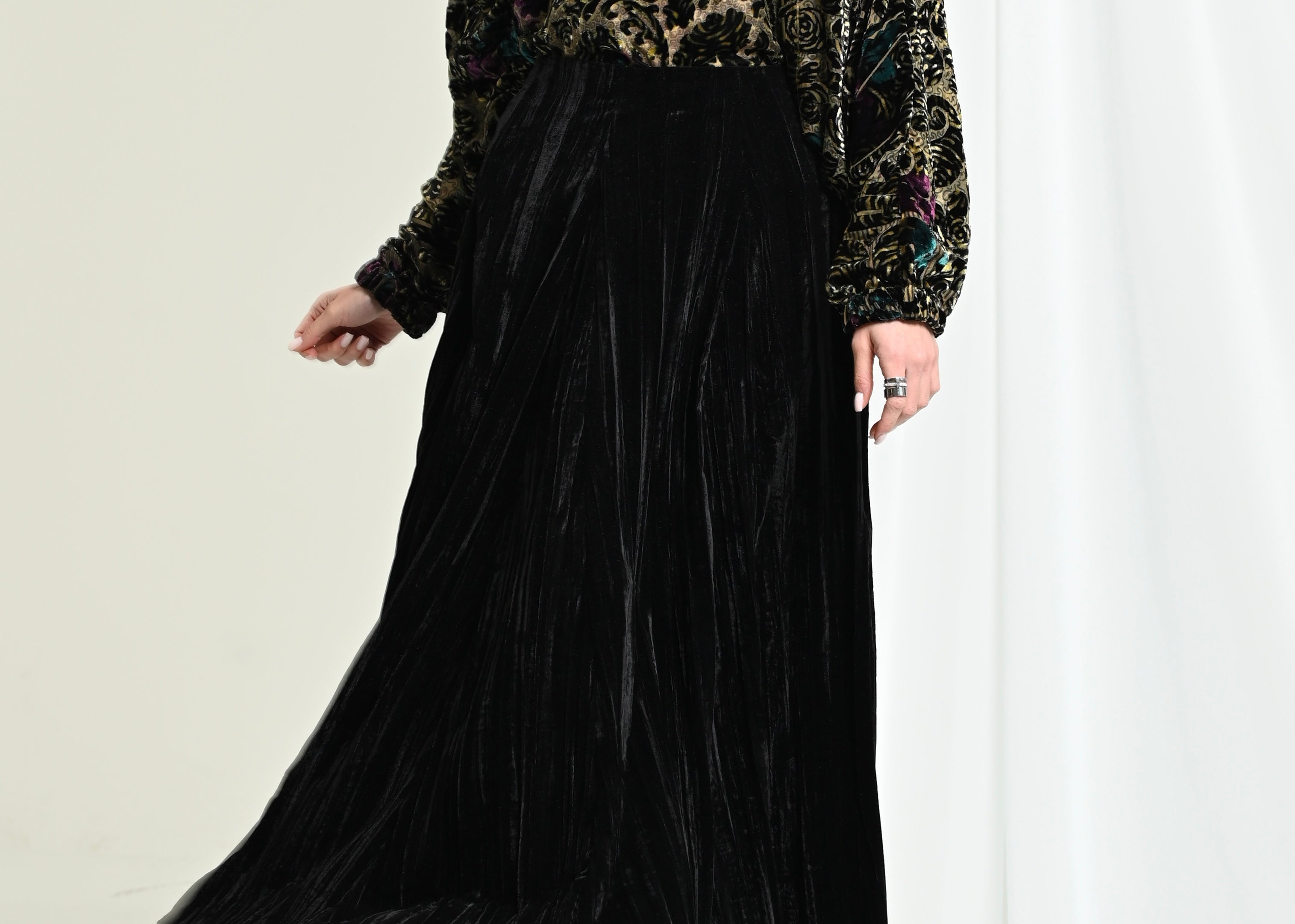- بلوزه: مخمل وشيفون بقصة عنق مرتفعه