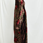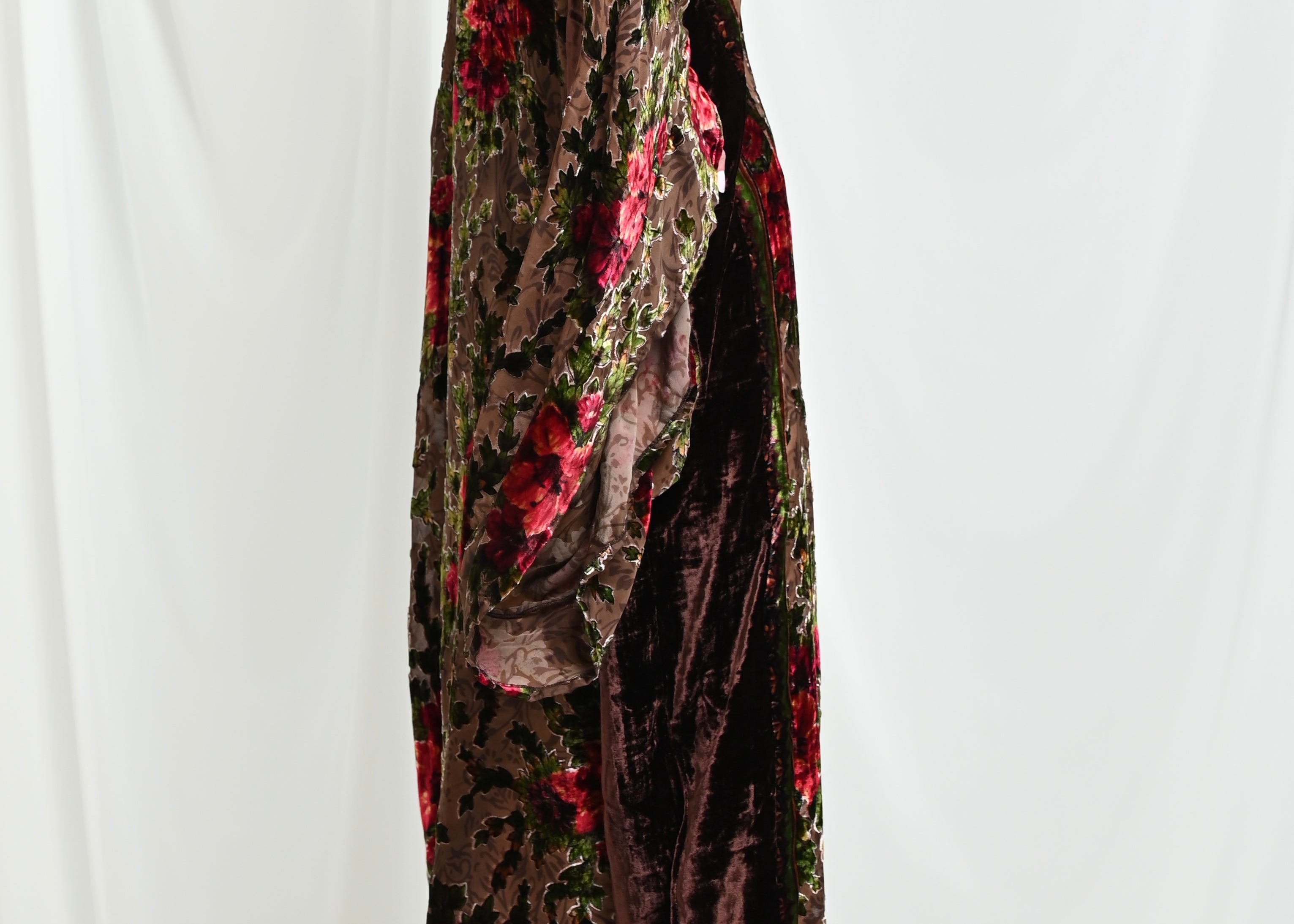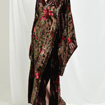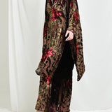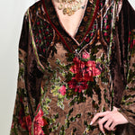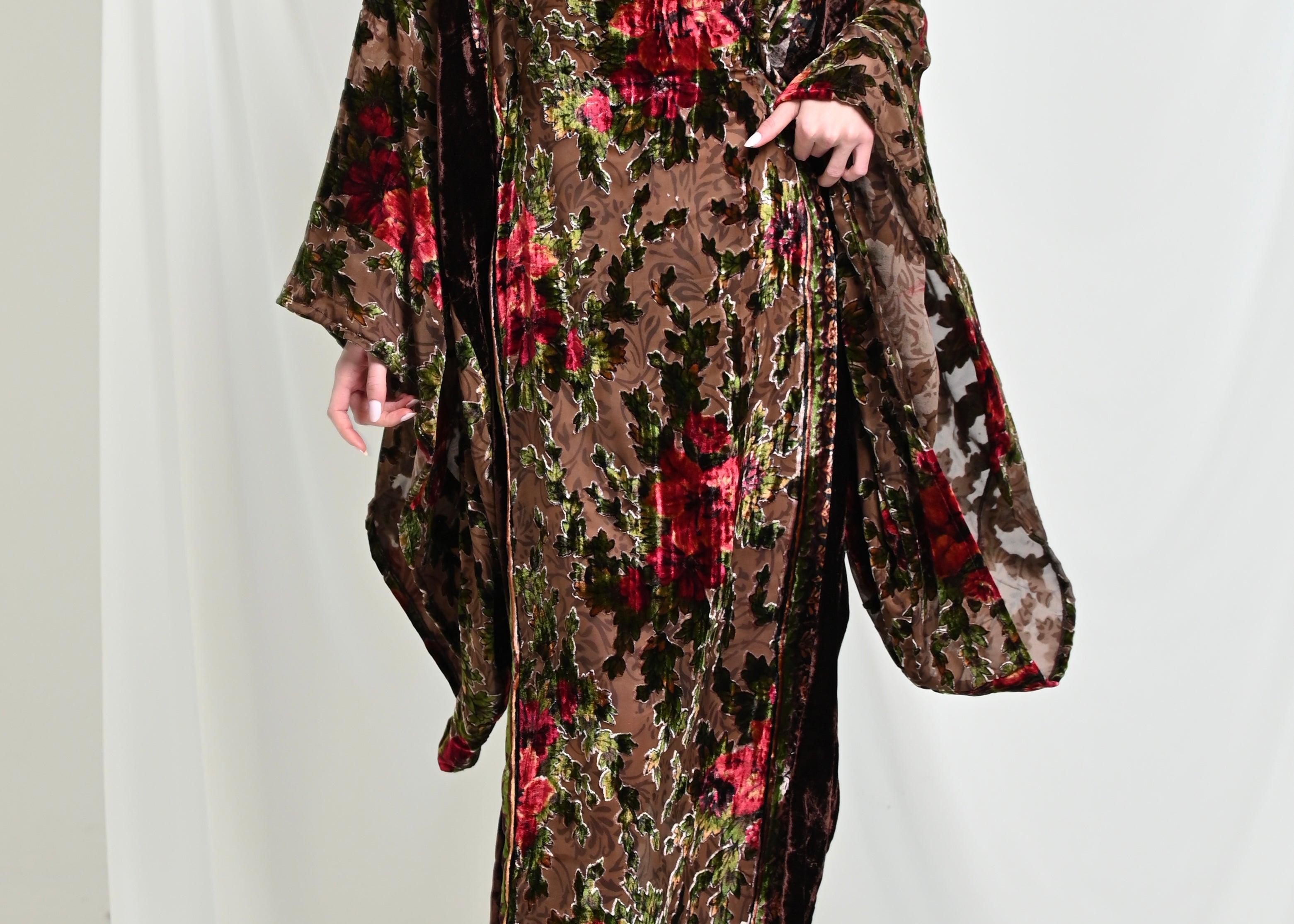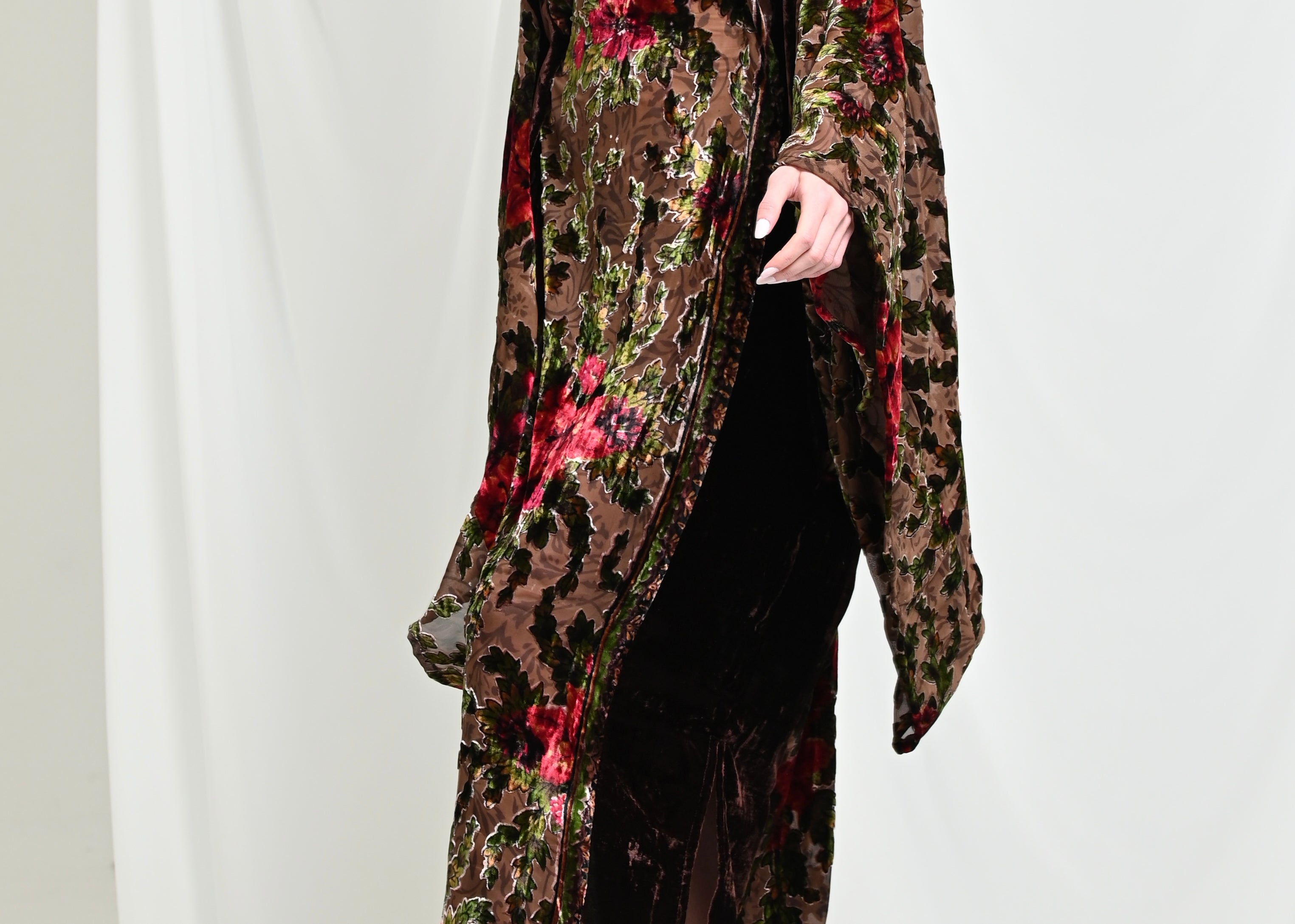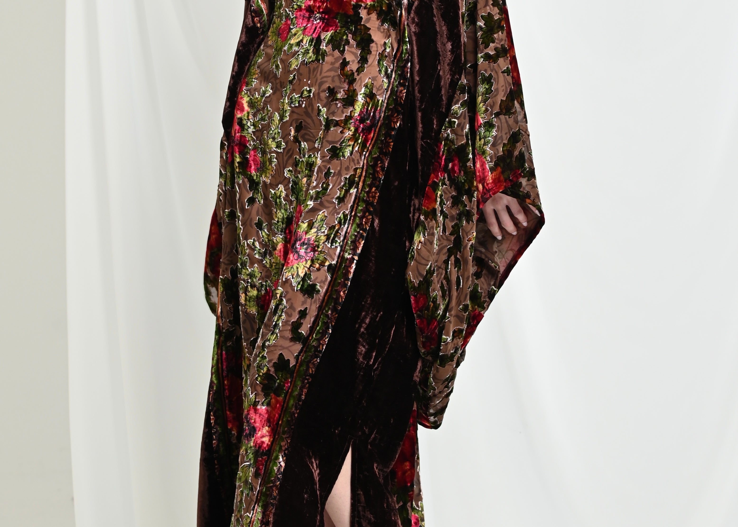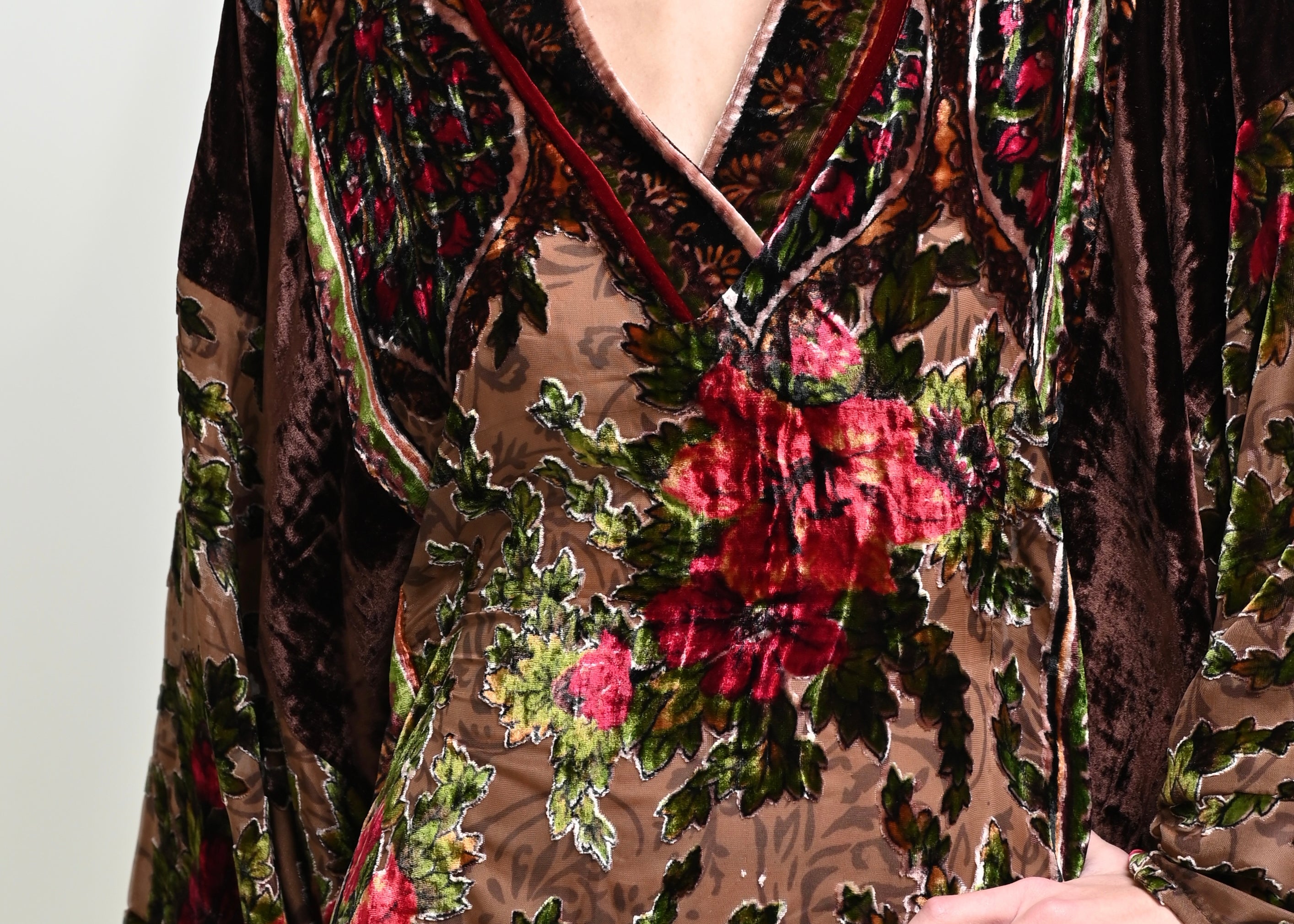 - A kaftan crafted from printed silk velvet with a distinctive pattern.