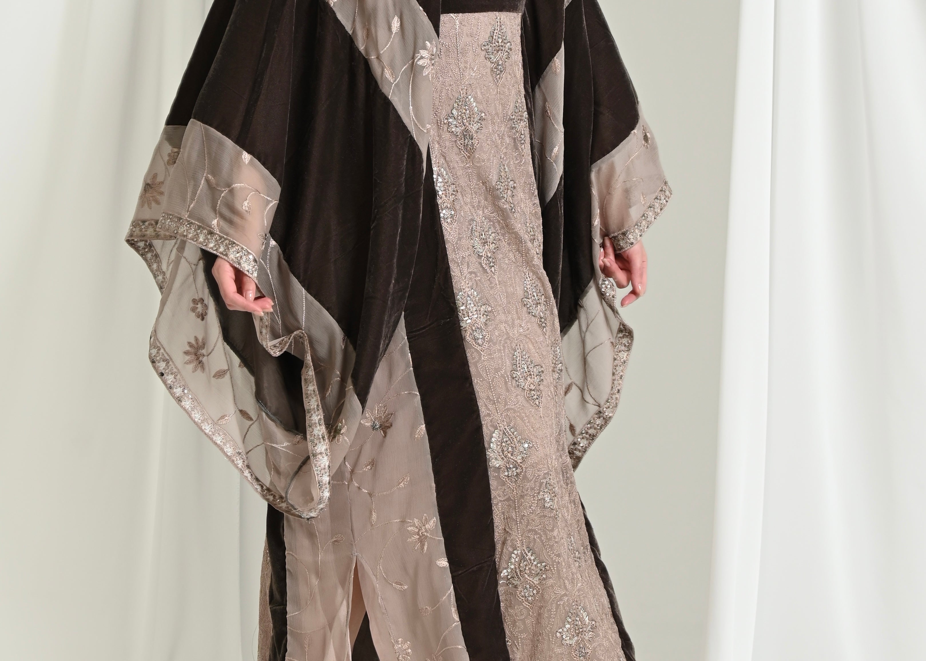 - Kaftan crafted from embroidered chiffon and velvet.