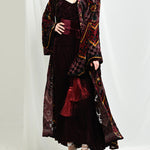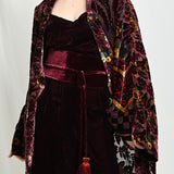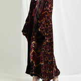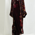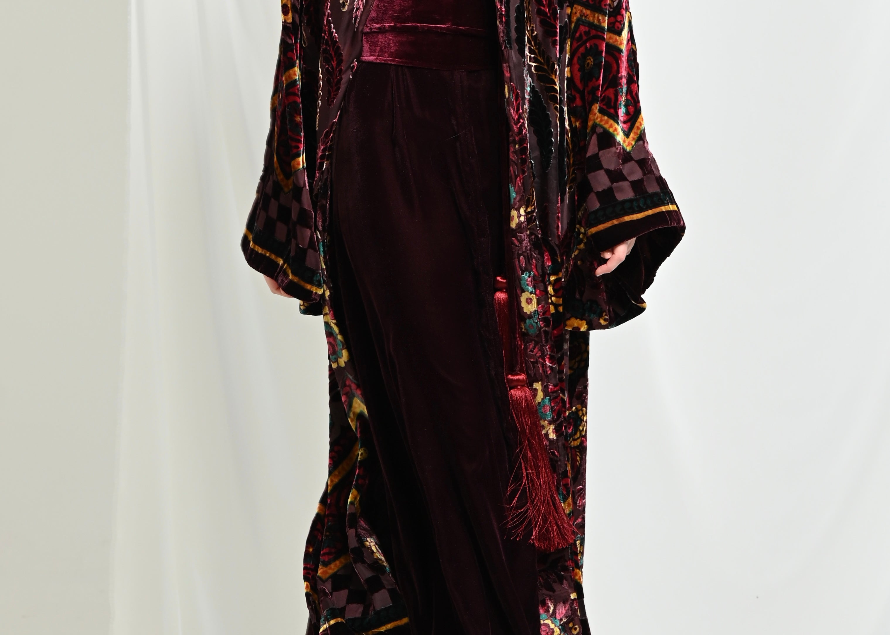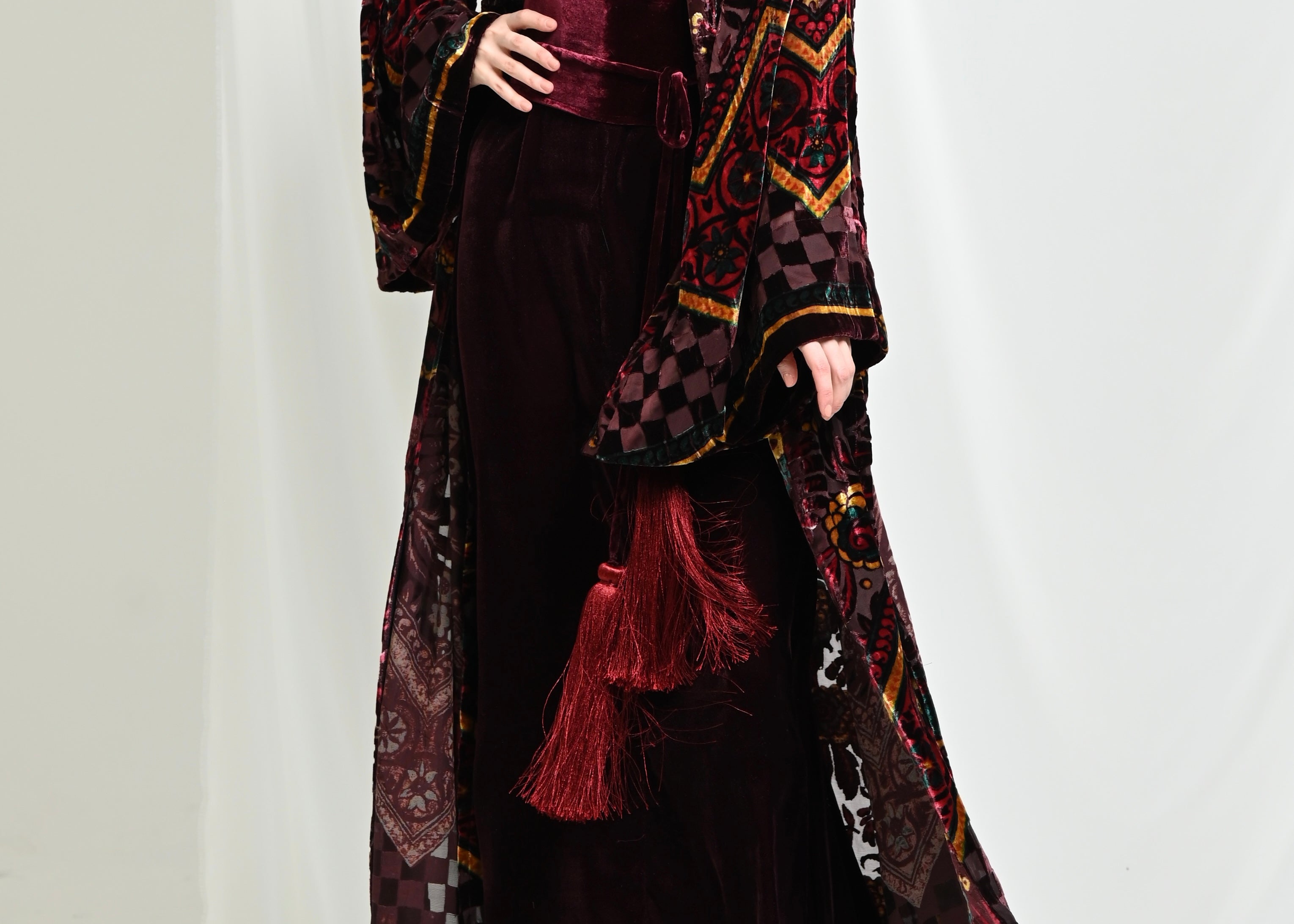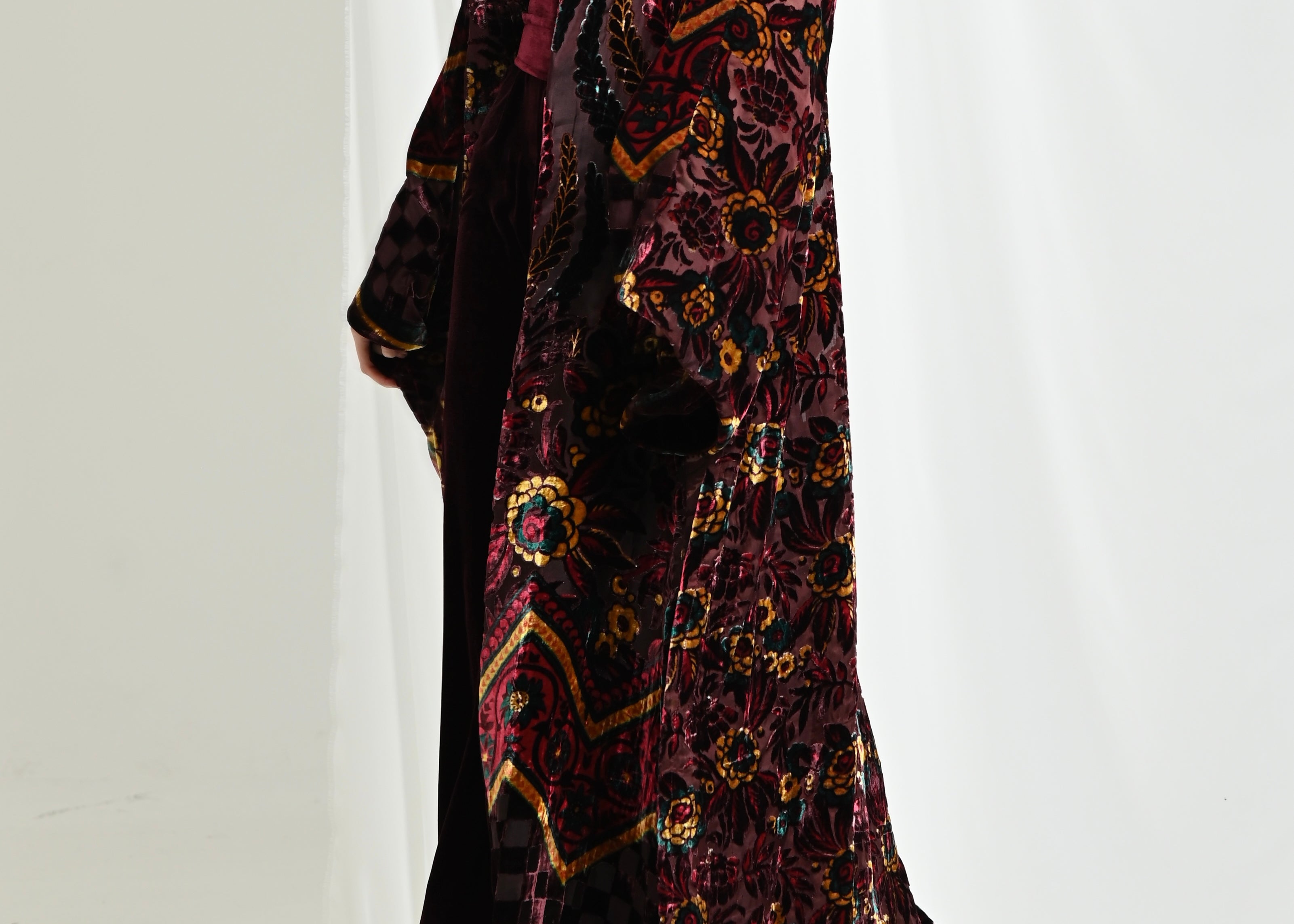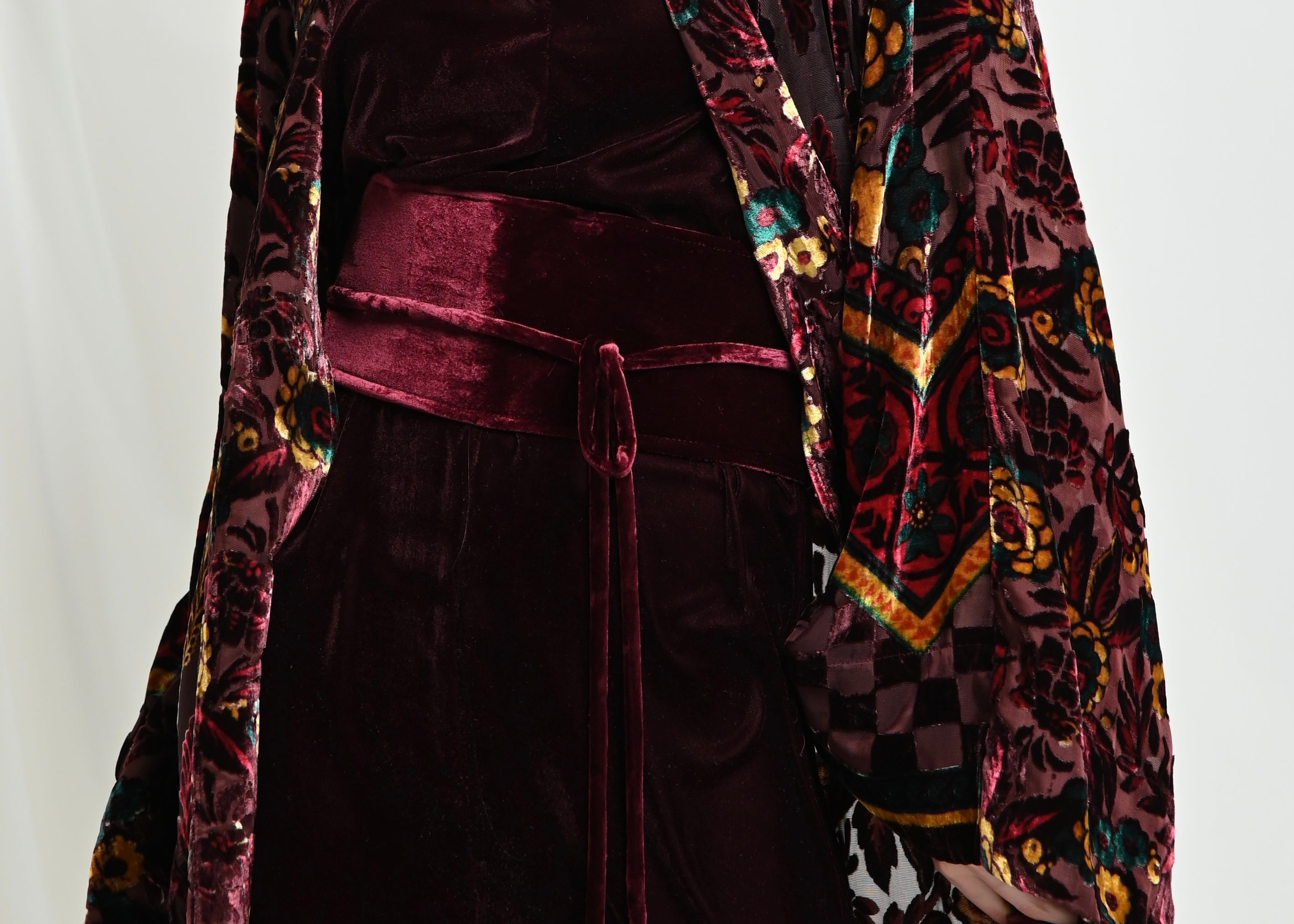 A kimono crafted from chiffon and silk velvet with a distinctive pattern, paired with a wide-cut velvet dress.