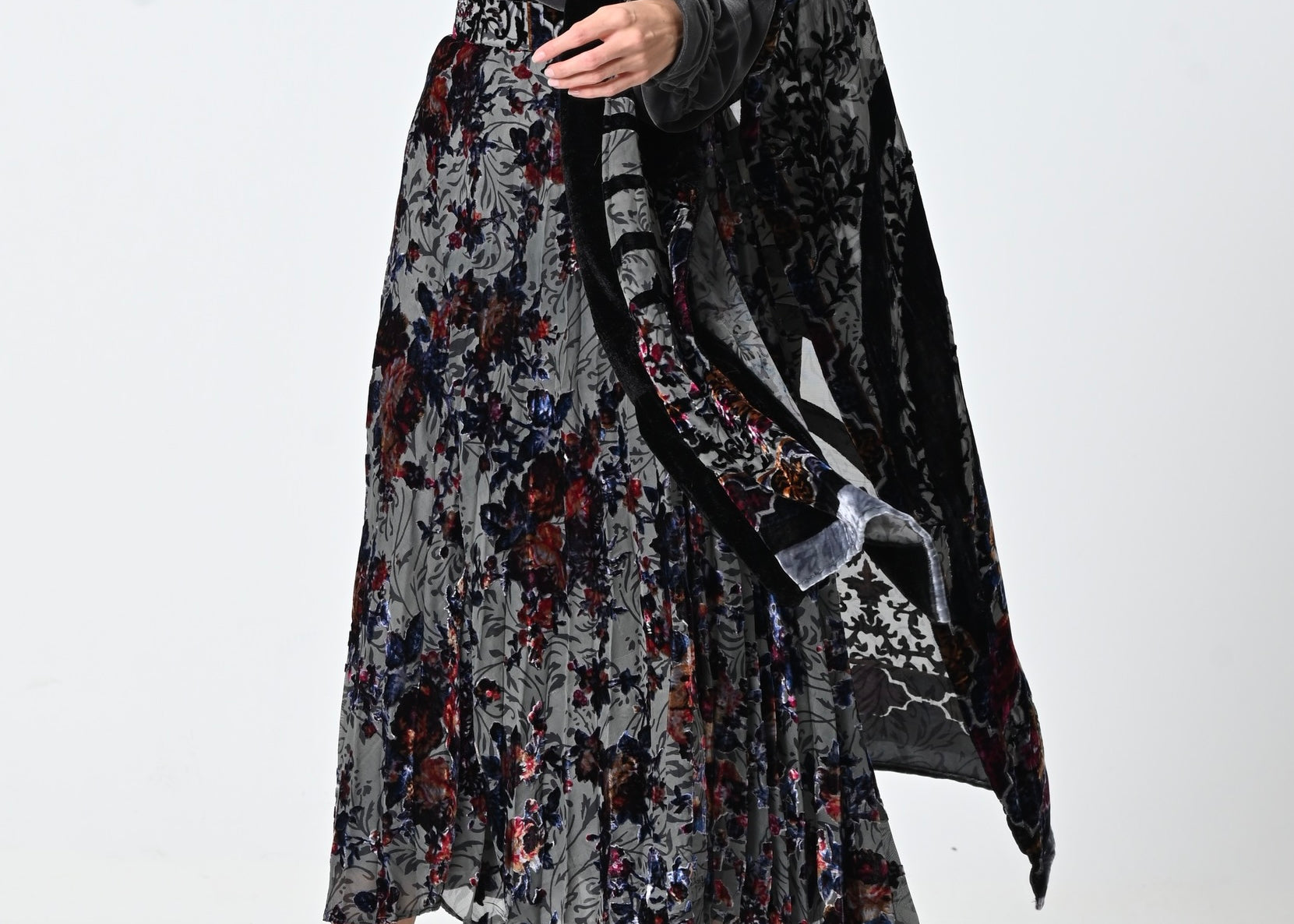 Grey Floral Velvet Chiffon Shawl Set