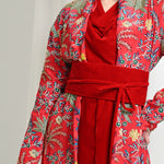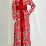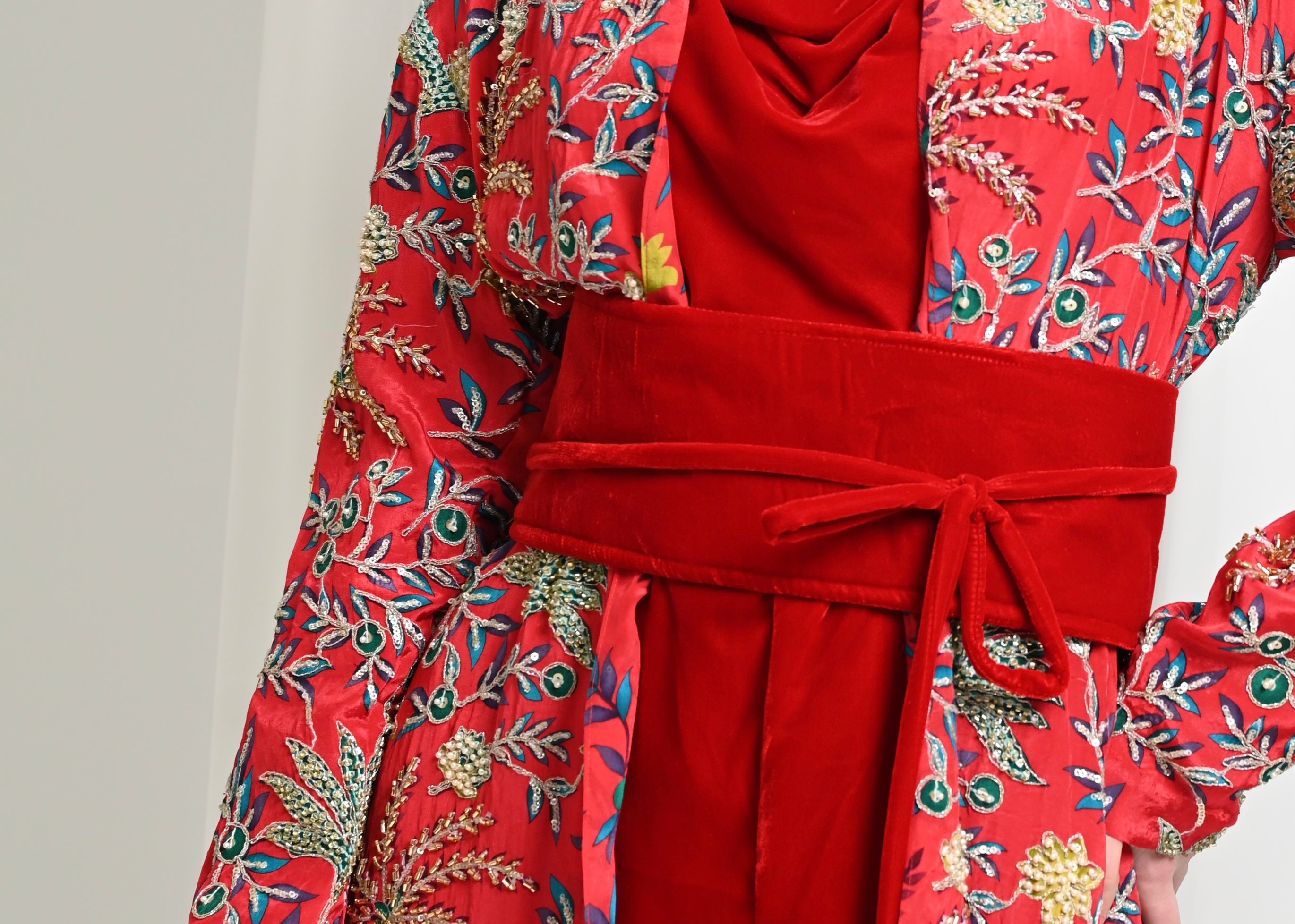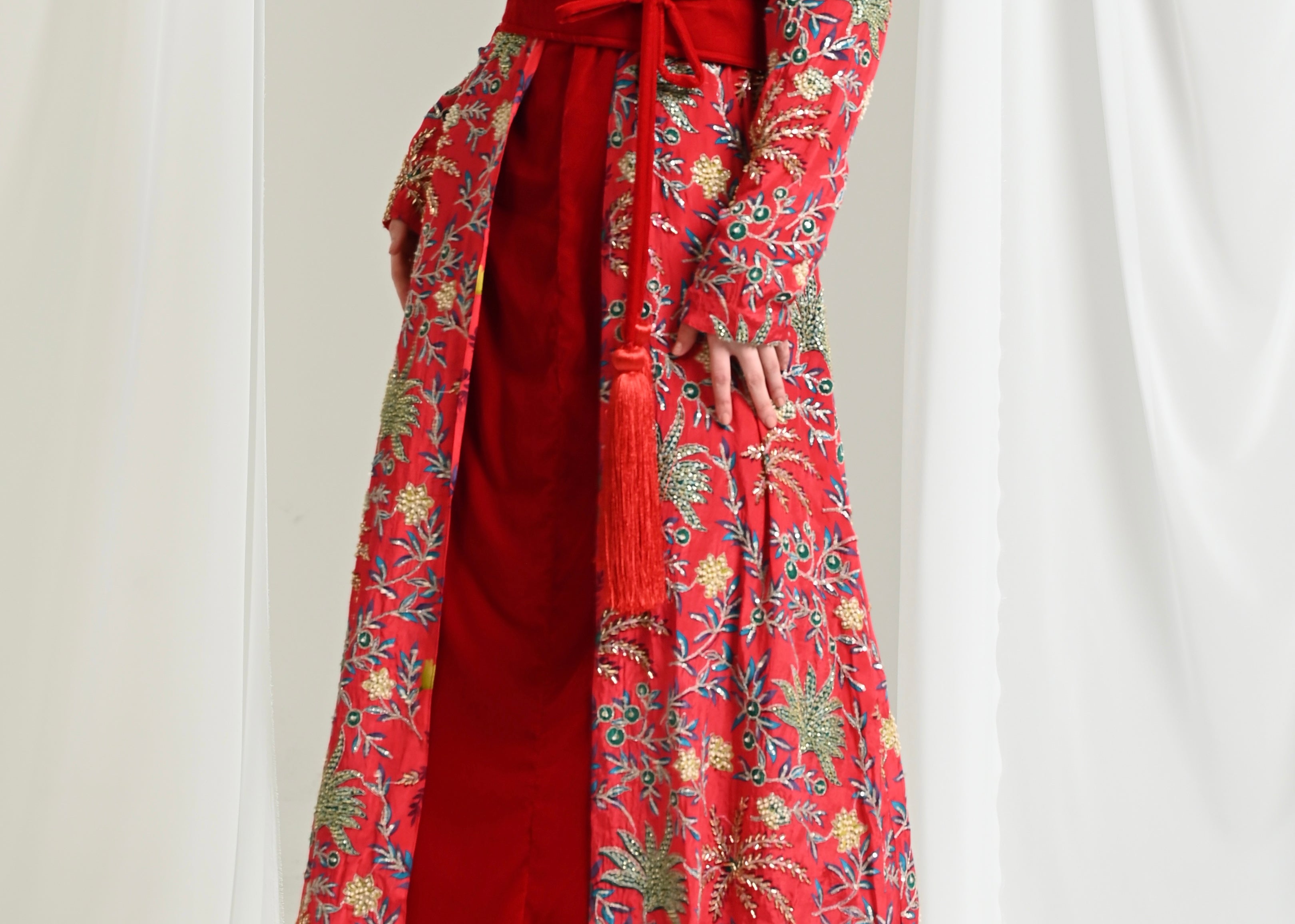 A Crepe Bisht with a wide-cut silk velvet dress.