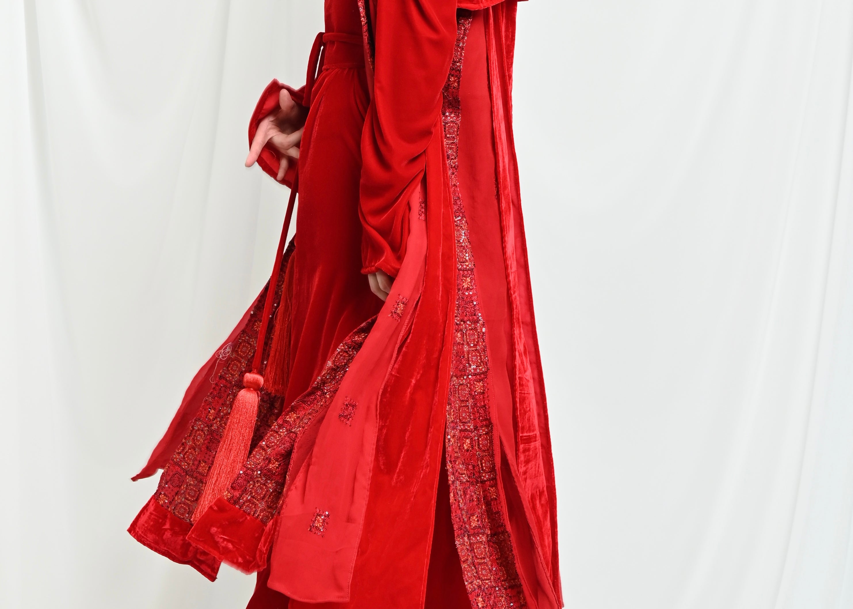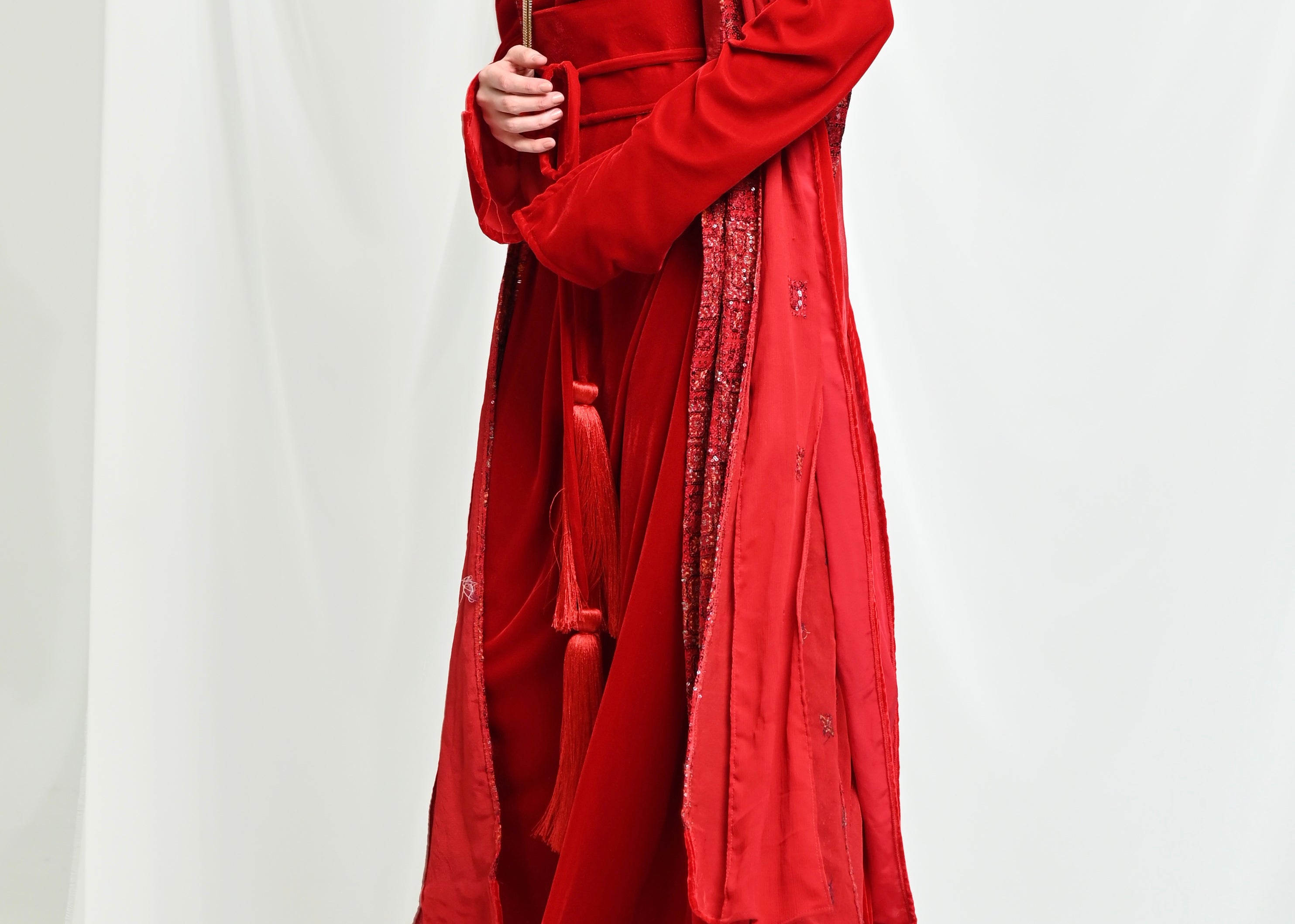 - • A fully embellished chiffon jacket, elegantly designed with distinctive cuts and coordinated with luxurious velvet fabric.