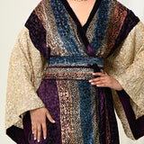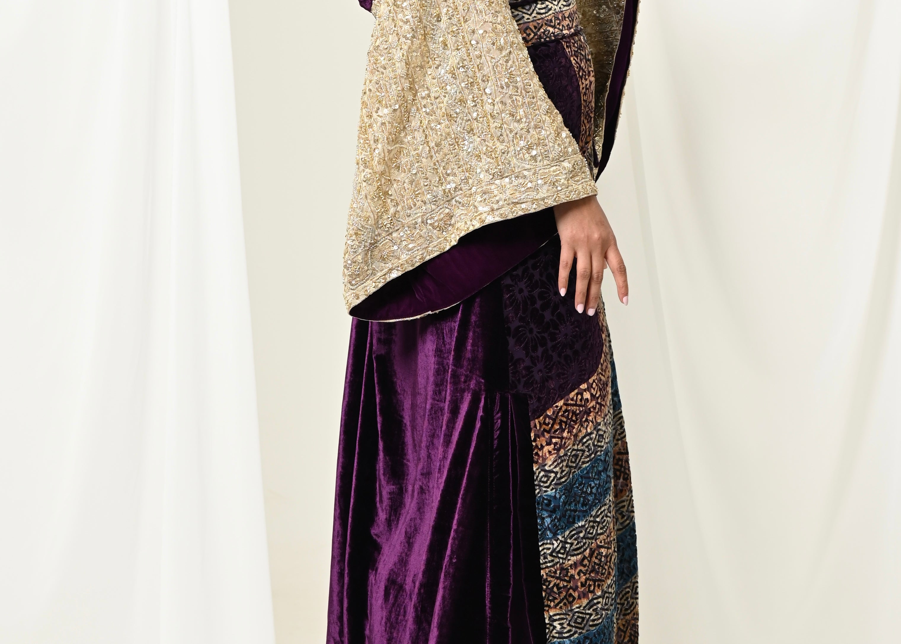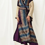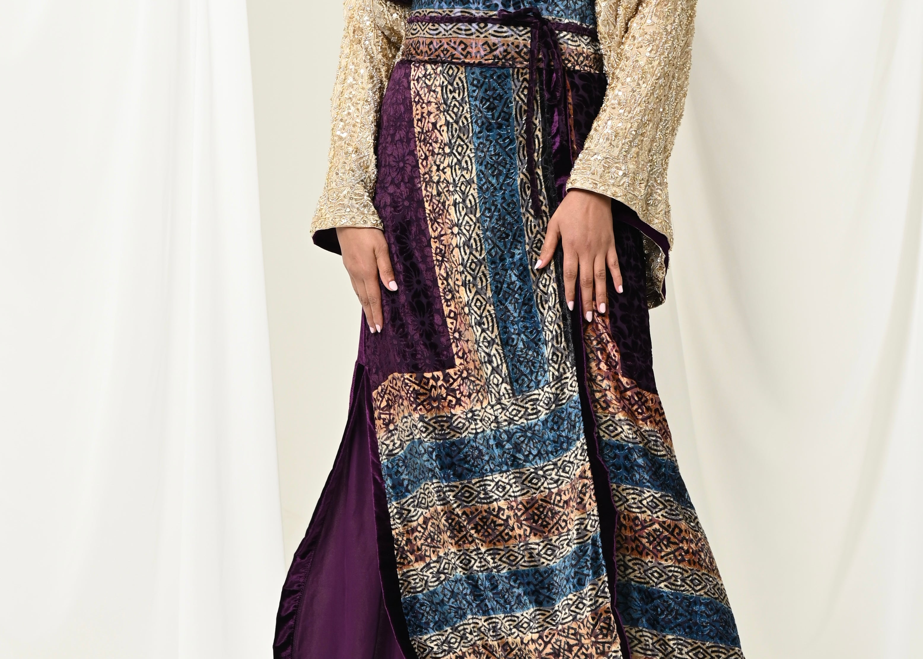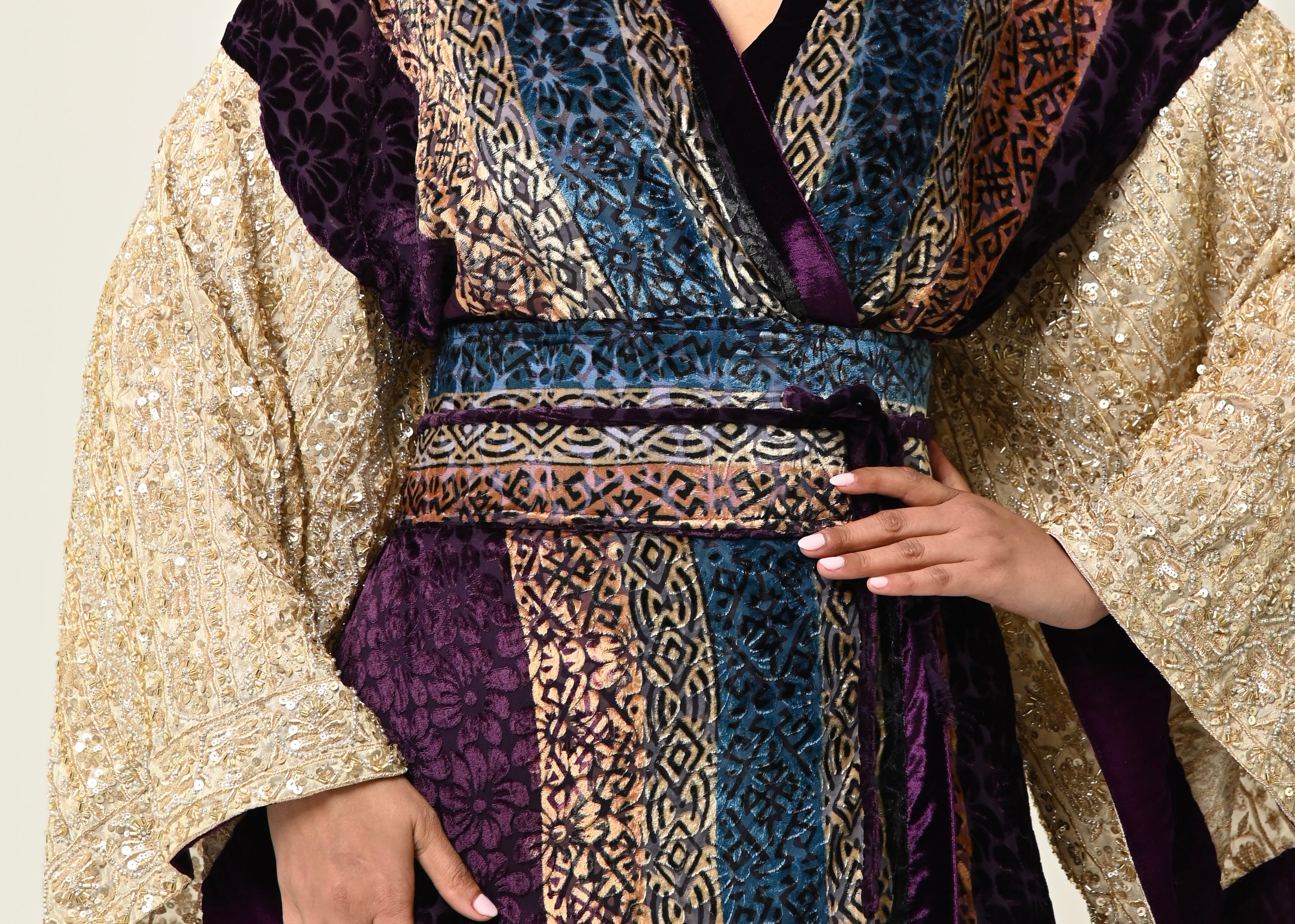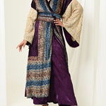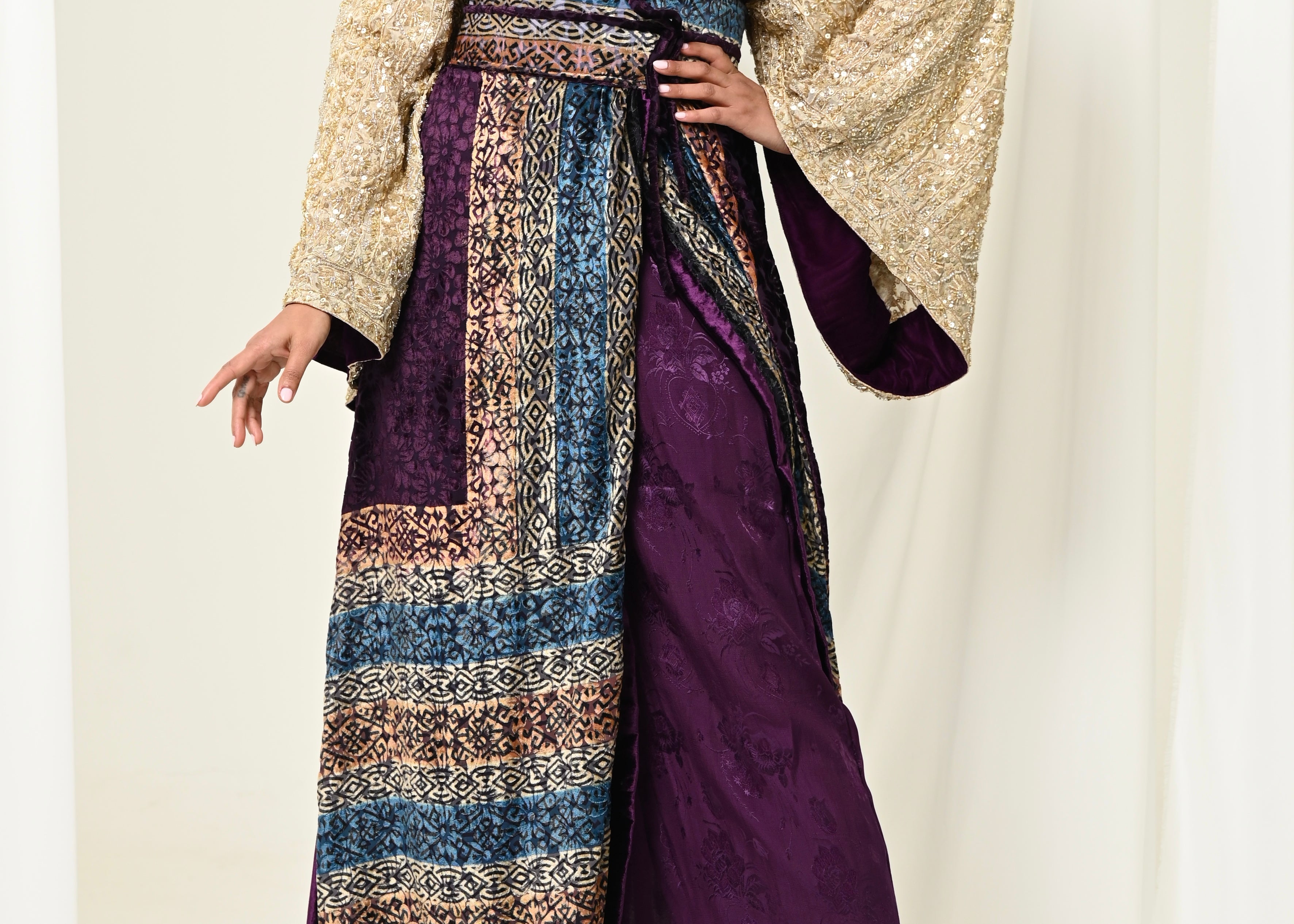 A luxurious Velvet bisht with heavy w sleeves and silk pants.