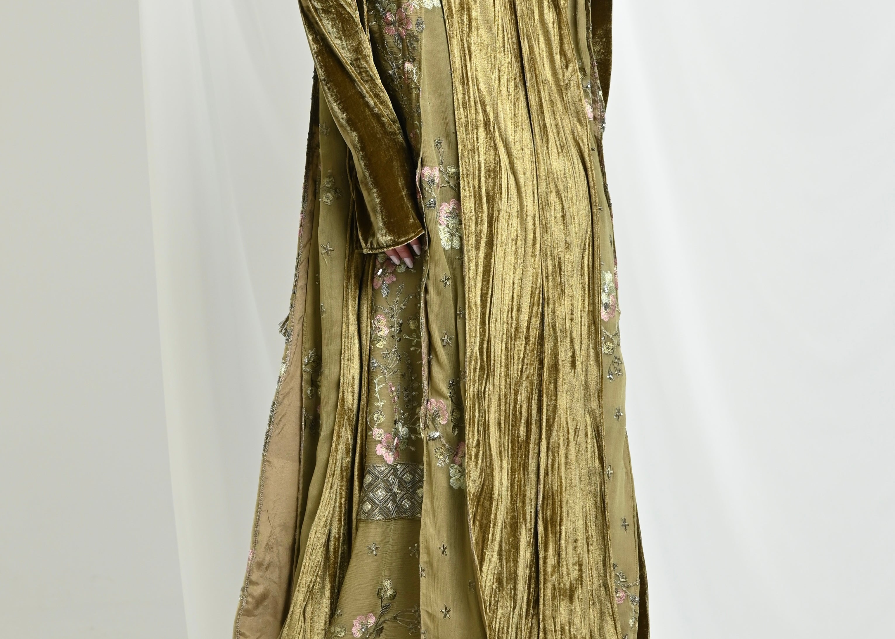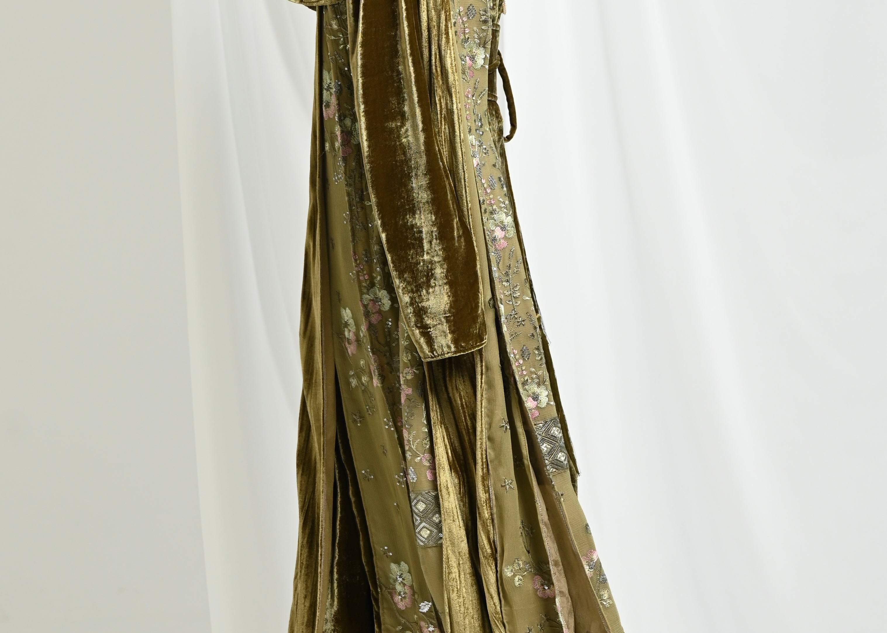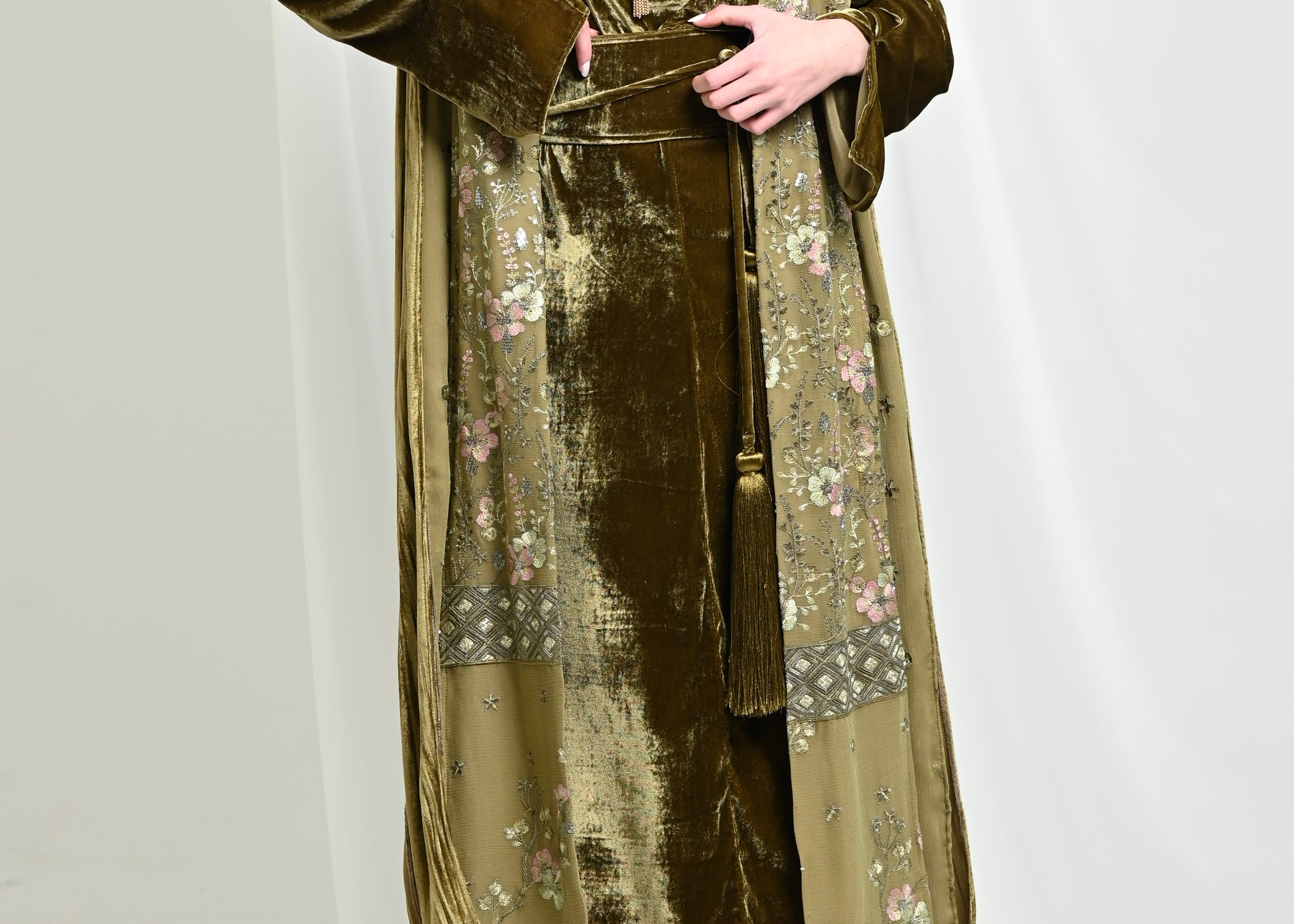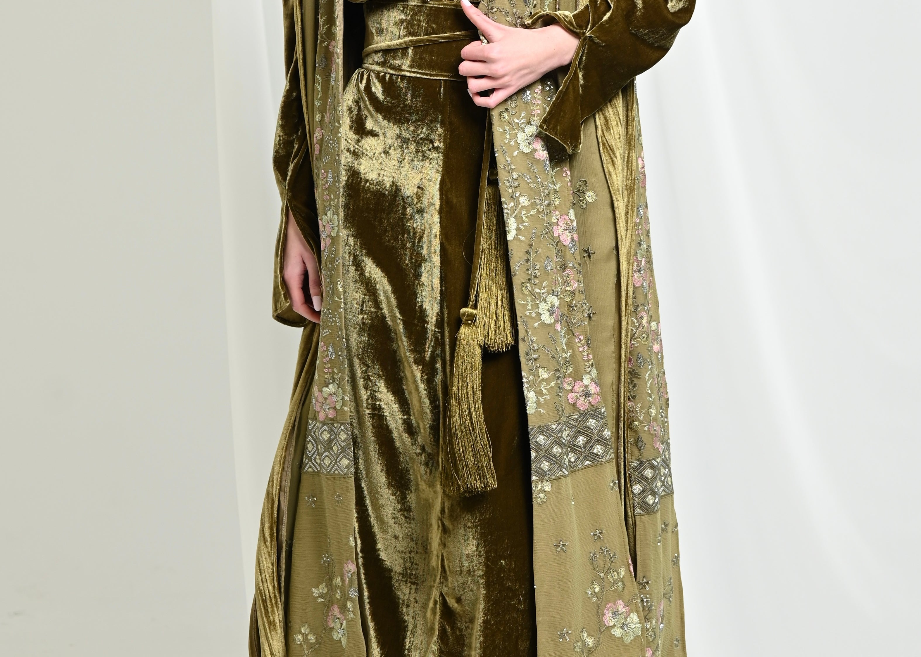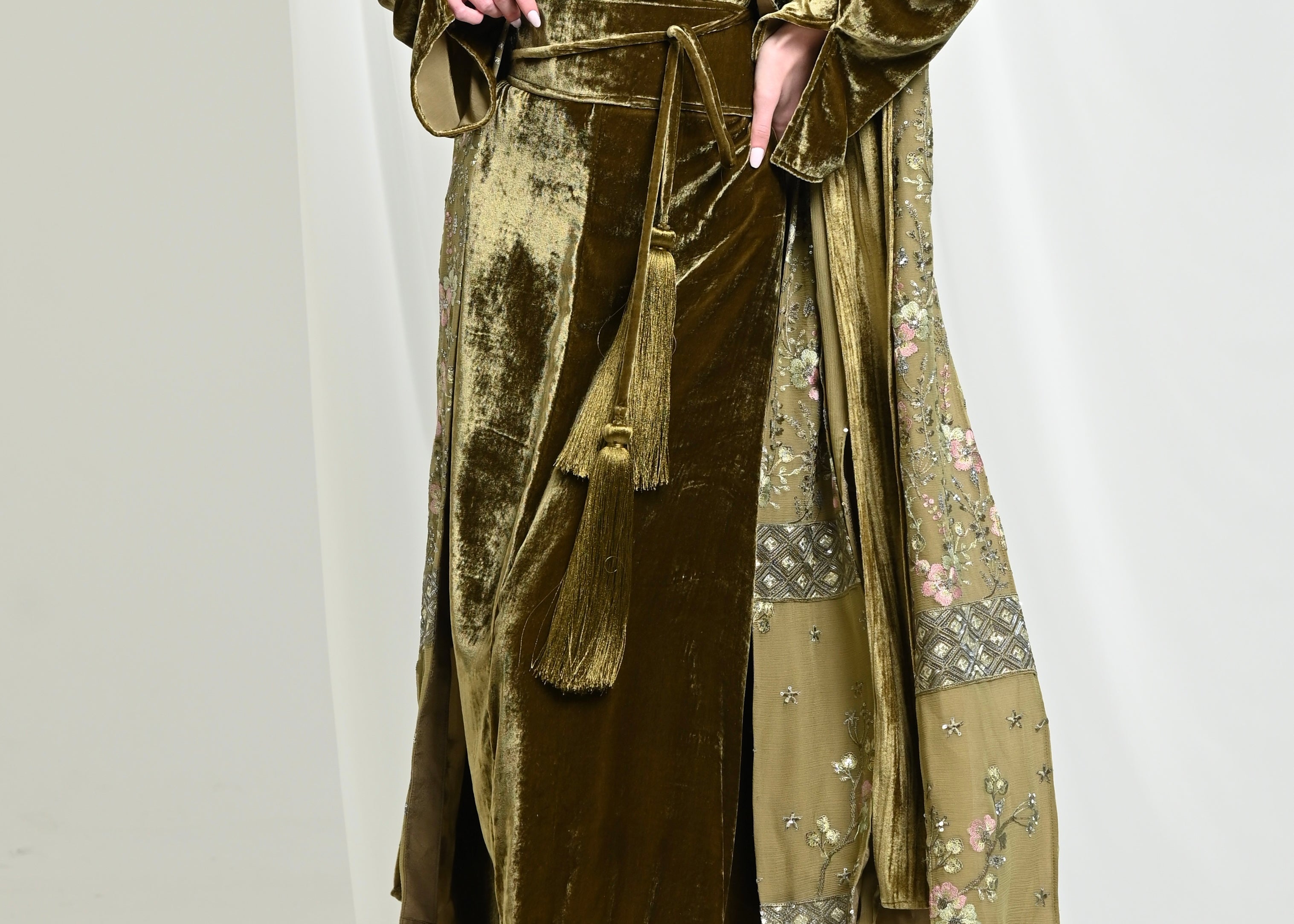 - A fully embellished chiffon jacket, elegantly designed with distinctive cuts and coordinated with luxurious velvet fabric.