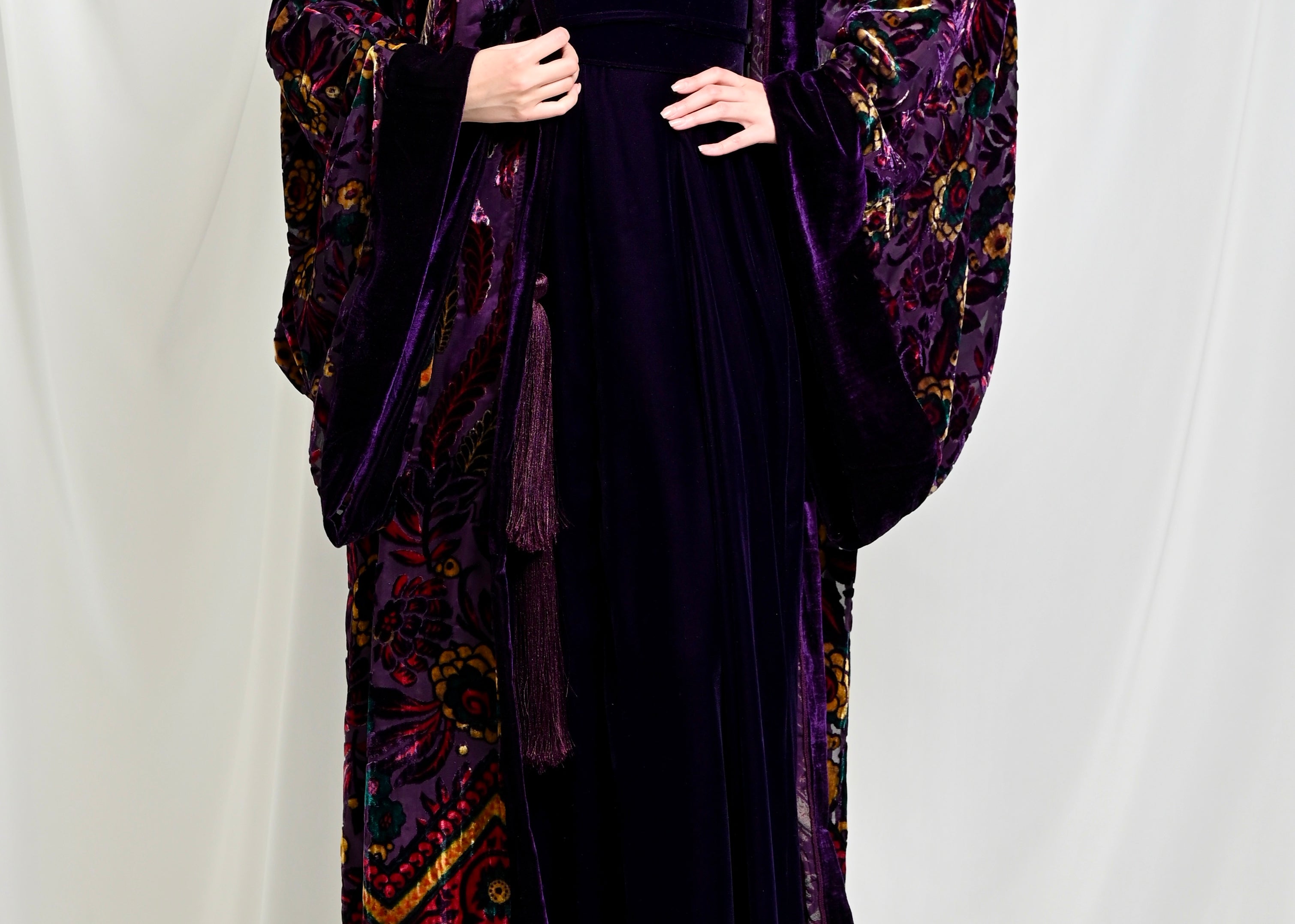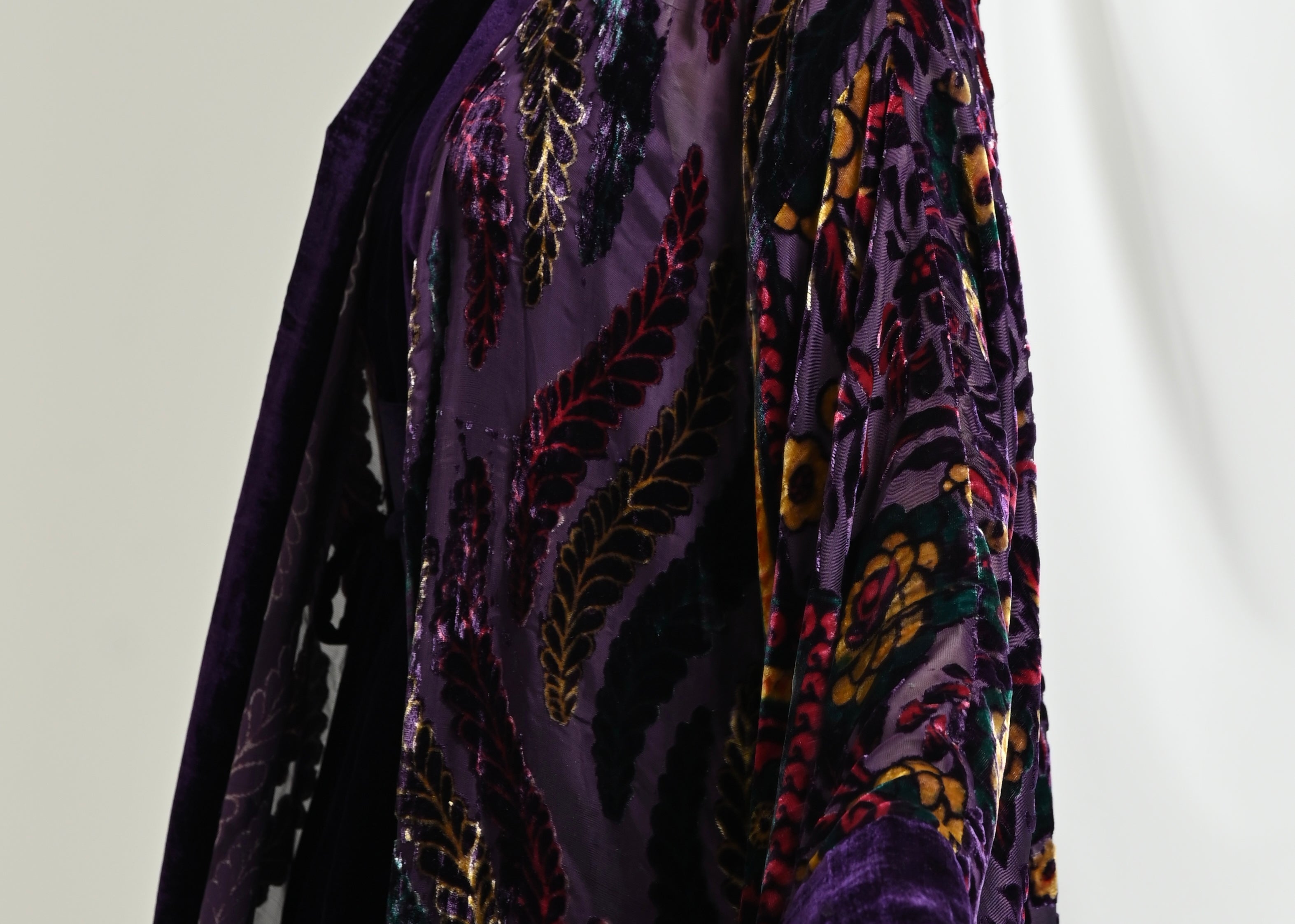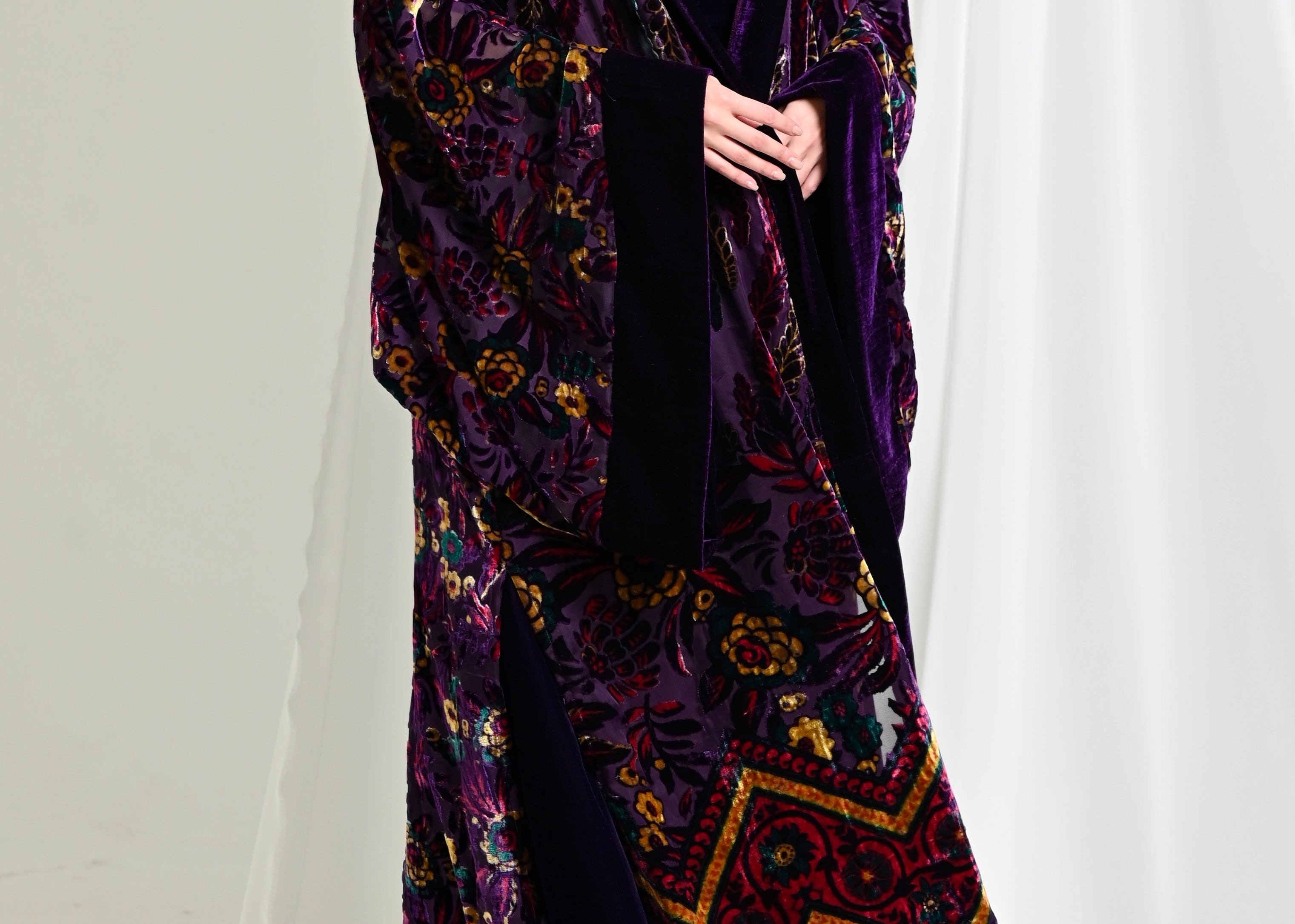 A kimono crafted from chiffon and silk velvet with a distinctive pattern, paired with a wide-cut velvet dress.