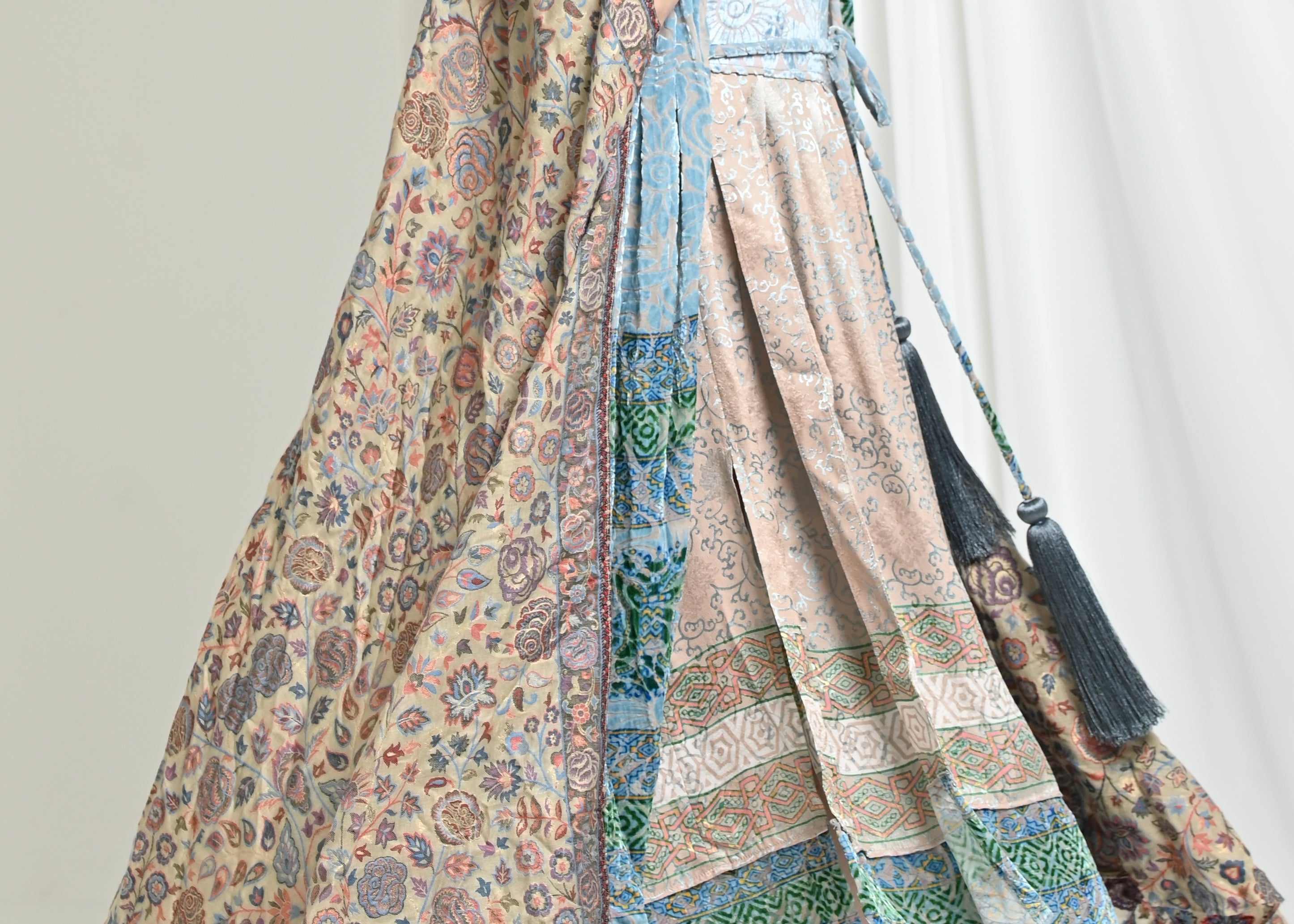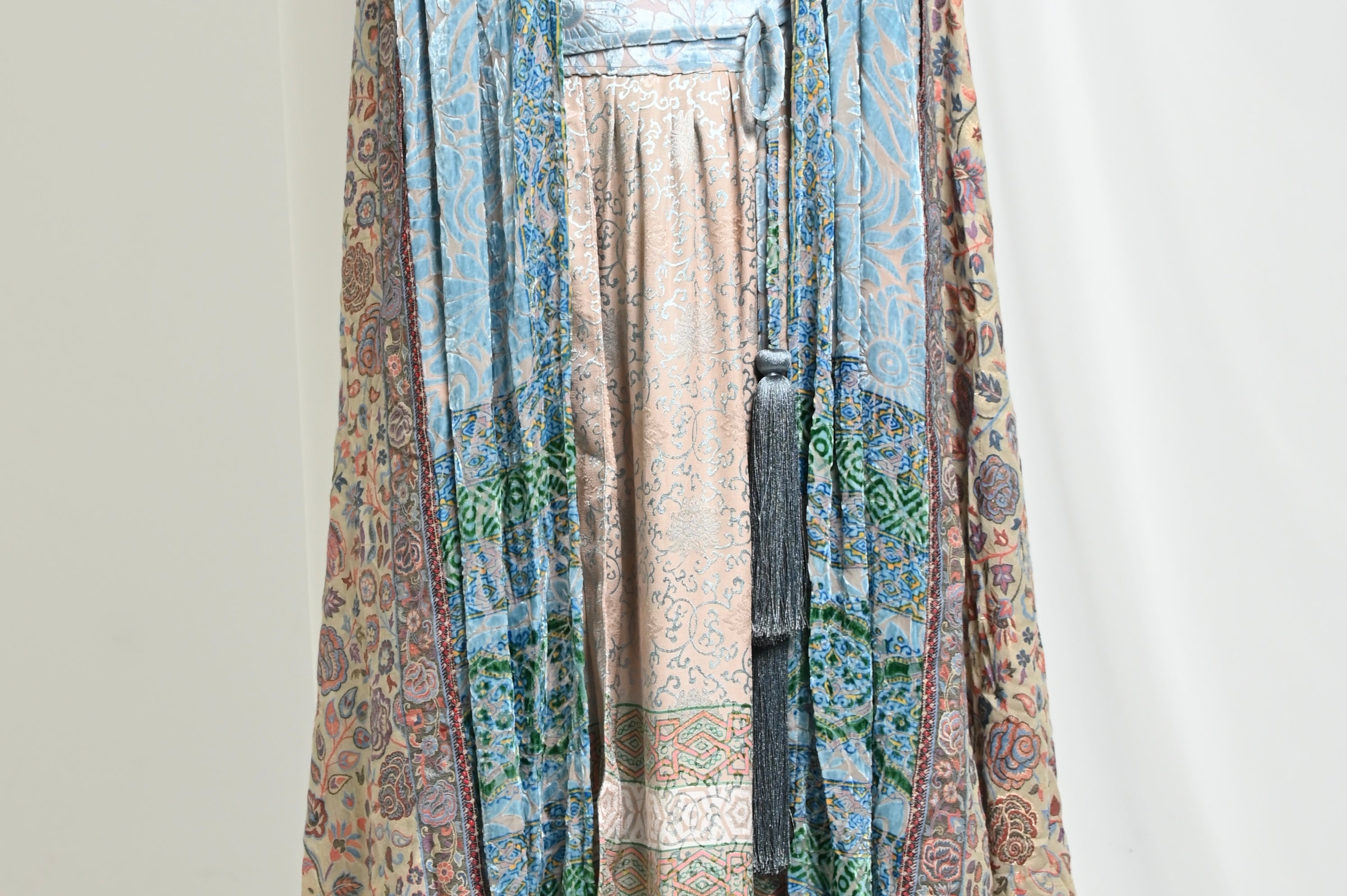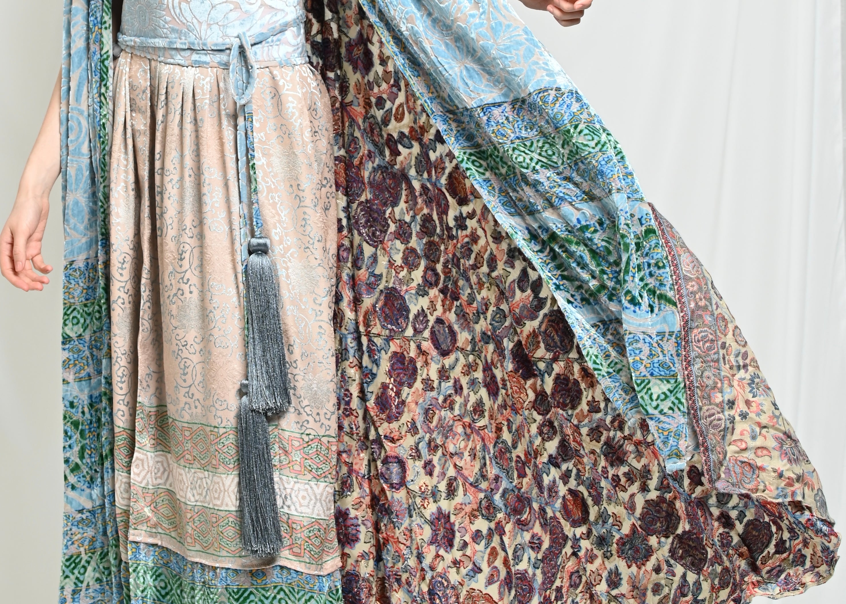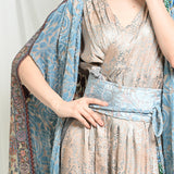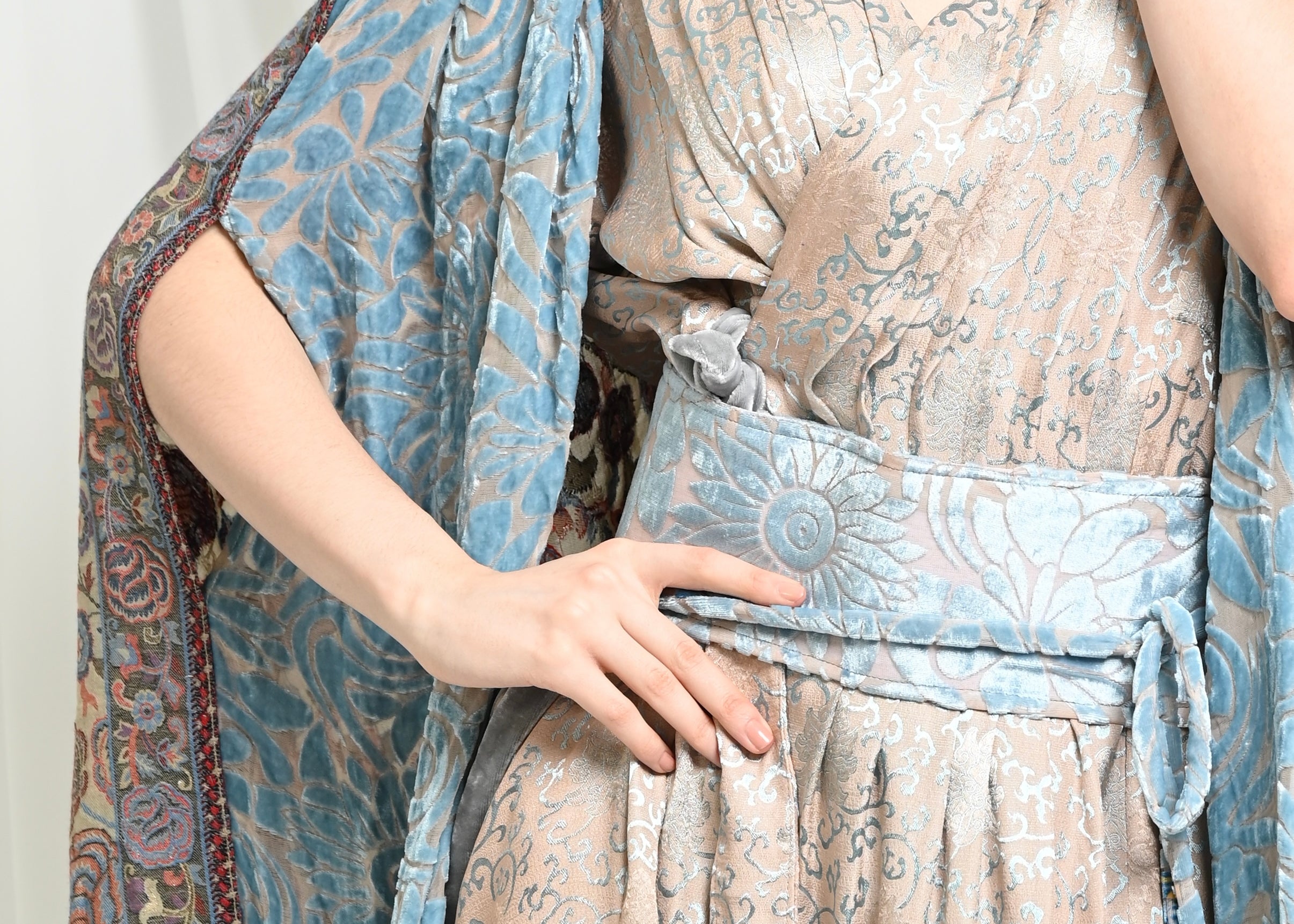 A distinctive cape crafted from chiffon and silk velvet, featuring a pashmina back in harmonious tones.