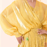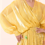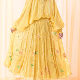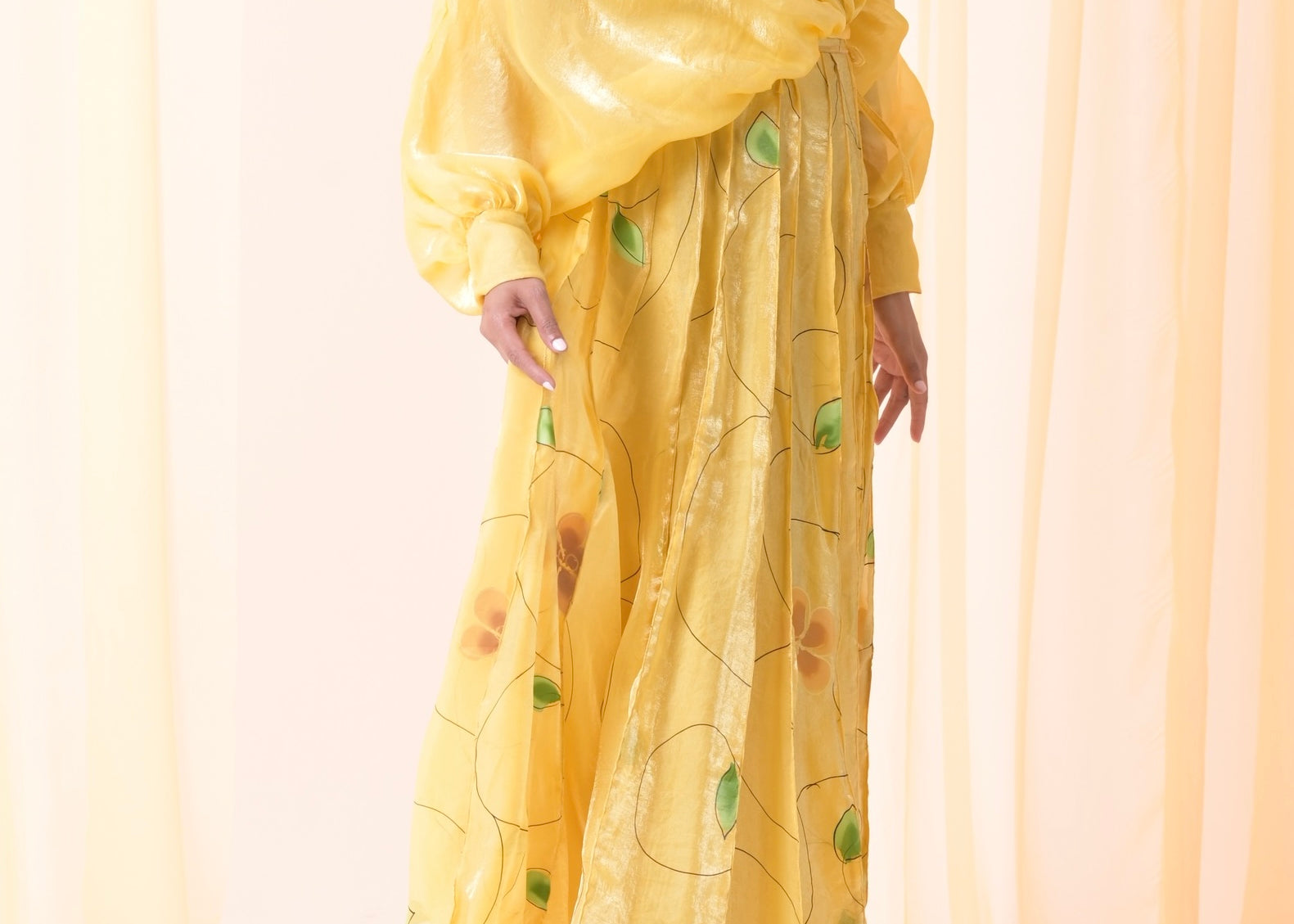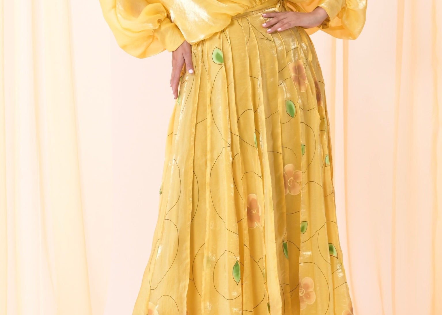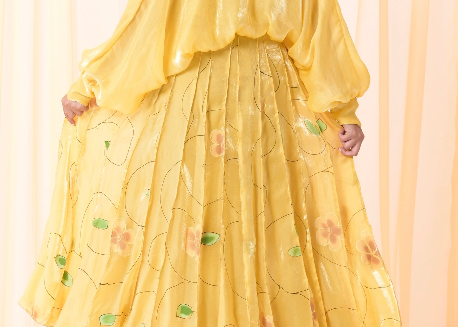 - Silk organza chiffon wrap shirt and hand painted skirt.